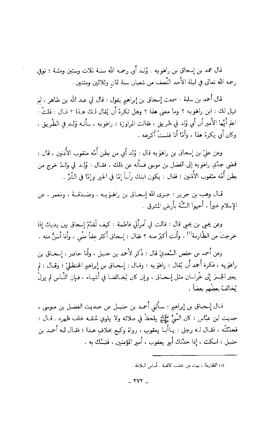 وعن أحمد بن حفص السعدي قال: ذكر لأحمد بن حنبل، وأنا حاضر، إسحاق بن راهويه، فكره أحمد أن يقال: راهويه؛ وقال: إسحاق بن إبراهيم الحنظلي؛ وقال: لم يعبر الجسر إلى خراسان مثل إسحاق، وإن كان يخالفنا في أشياء، فإن الناس لم يزل يخالف بعضهم بعضاً.