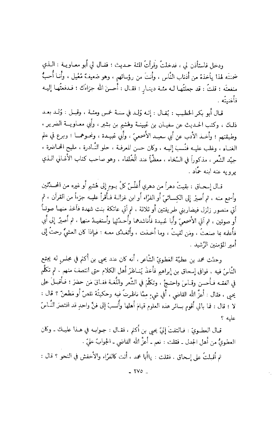 ثم أقبلت على إسحاق، فقلت: يا أبا محمد، أنت كالفراء والأخفش في النحو؟ قال: