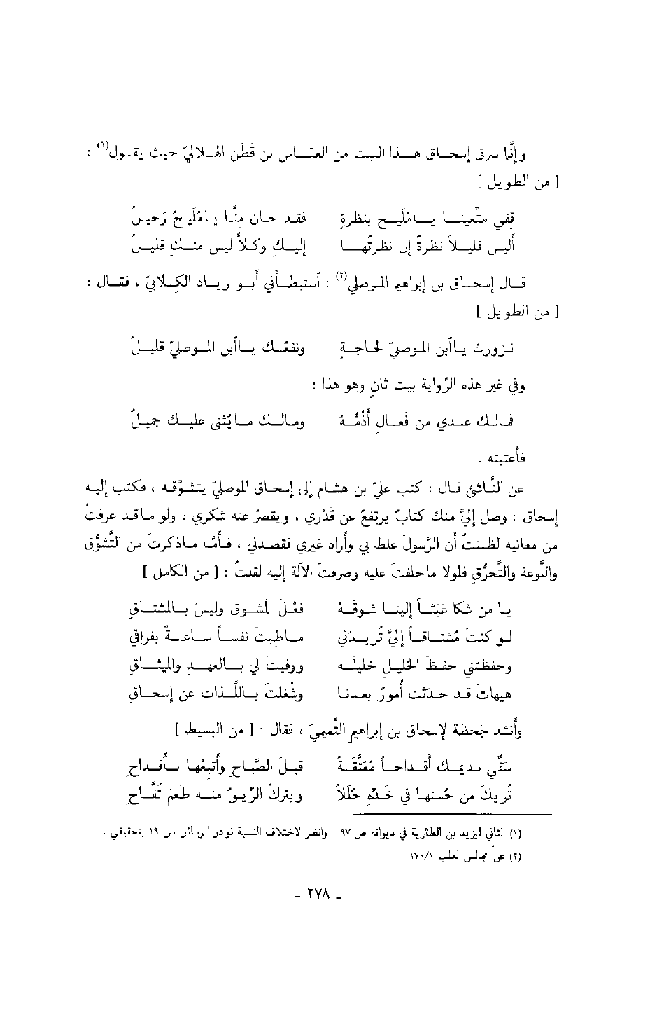 عن الناشئ قال: كتب علي بن هشام إلى إسحاق الموصلي يتشوقه، فكتب إليه إسحاق: وصل إلي منك كتاب يرتفع عن قدري، ويقصر عنه شكري، ولو ما قد عرفت من معانيه لظننت أن الرسول غلط بي وأراد غيري فقصدني، فأما ما ذكرت من التشويق واللوعة والتحريق فلولا ما حلفت عليه وصرفت الآلة إليه لقلت: من الكامل