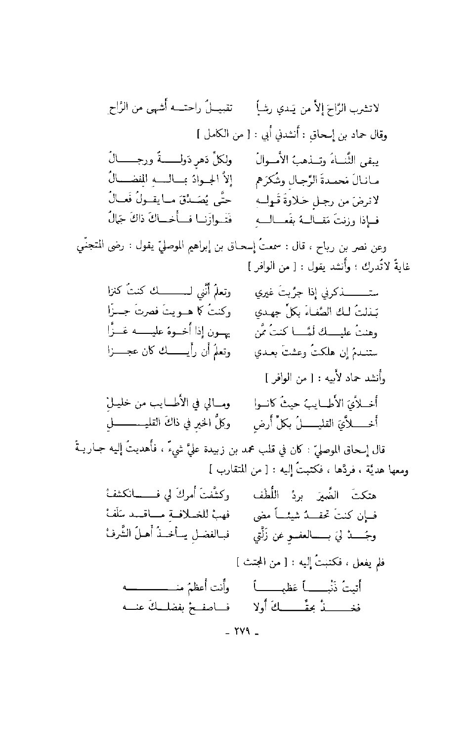 وعن نصر بن رباح، قال: سمعت إسحاق بن إبراهيم الموصلي يقول: رضى المتجني غاية لا تدرك؛ وأنشد يقول: من الوافر