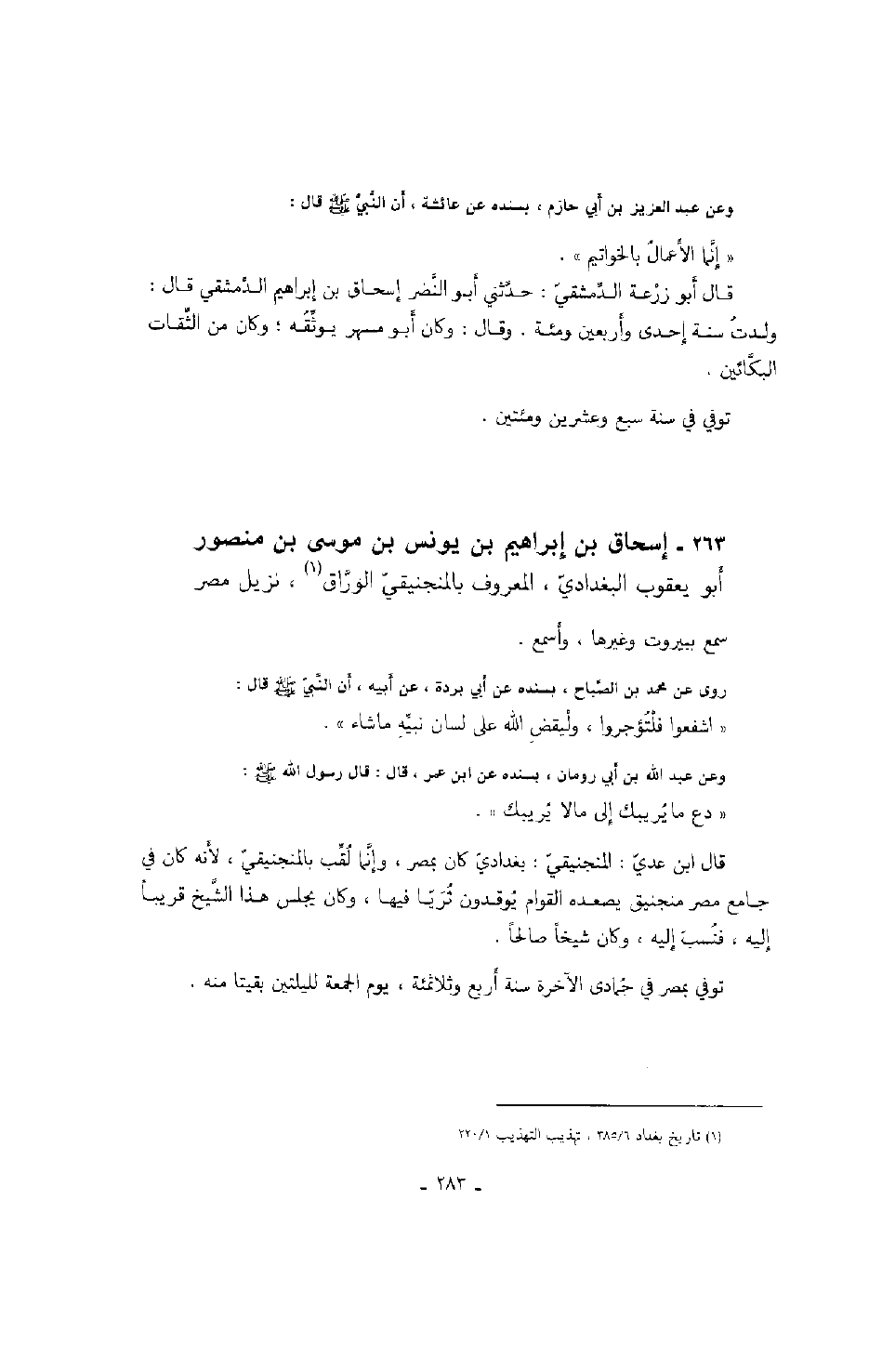 قال ابن عدي: المنجنيقي: بغدادي كان بمصر، وإنما لقب بالمنجنيقي، لأنه كان في جامع مصر منجنيق يصعده القوام يوقدون ثريا فيها، وكان يجلس هذا الشيخ قريباً إليه، فنسب إليه، وكان شيخاً صالحاً.