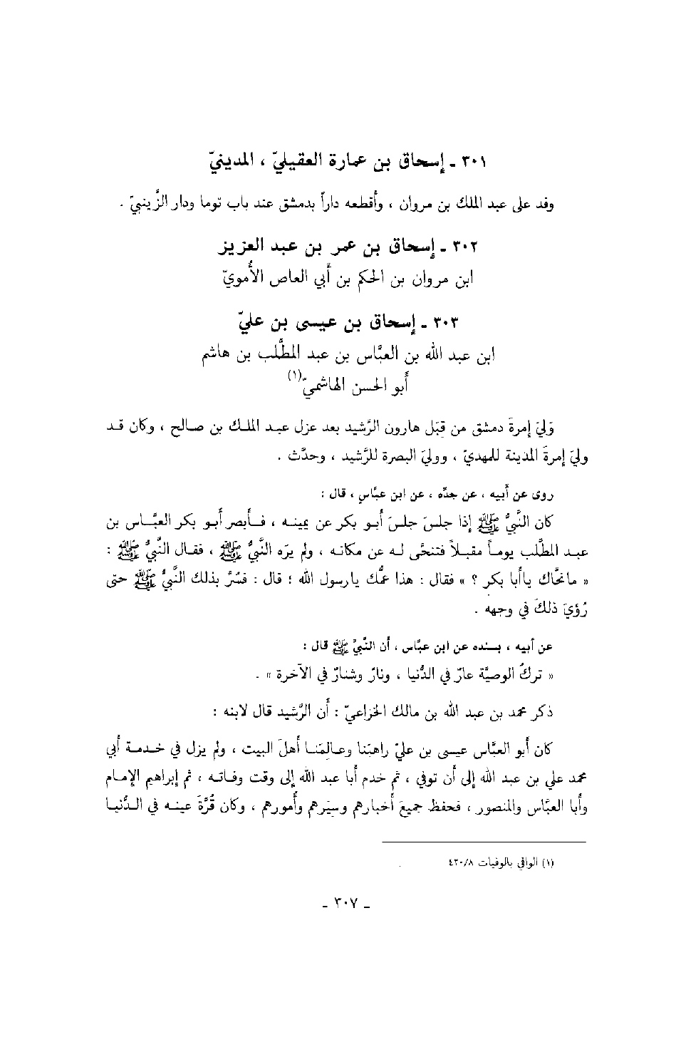 روى عن أبيه، عن جده، عن ابن عباس، قال: كان النبي صَلَّى اللهُ عَلَيْهِ وَسَلَّمَ إذا جلس جلس أبو بكر عن يمينه، فأبصر أبو بكر العباس بن عبد المطلب يوماً مقبلاً فتنحى له عن مكانه، ولم يره النبي صَلَّى اللهُ عَلَيْهِ وَسَلَّمَ، فقال النبي صَلَّى اللهُ عَلَيْهِ وَسَلَّمَ " ما نحاك يا أبا بكر؟ " فقال: هذا عمك يا رسول الله؛ قال: فسر بذلك النبي صَلَّى اللهُ عَلَيْهِ وَسَلَّمَ حتى رؤي ذلك في وجهه.