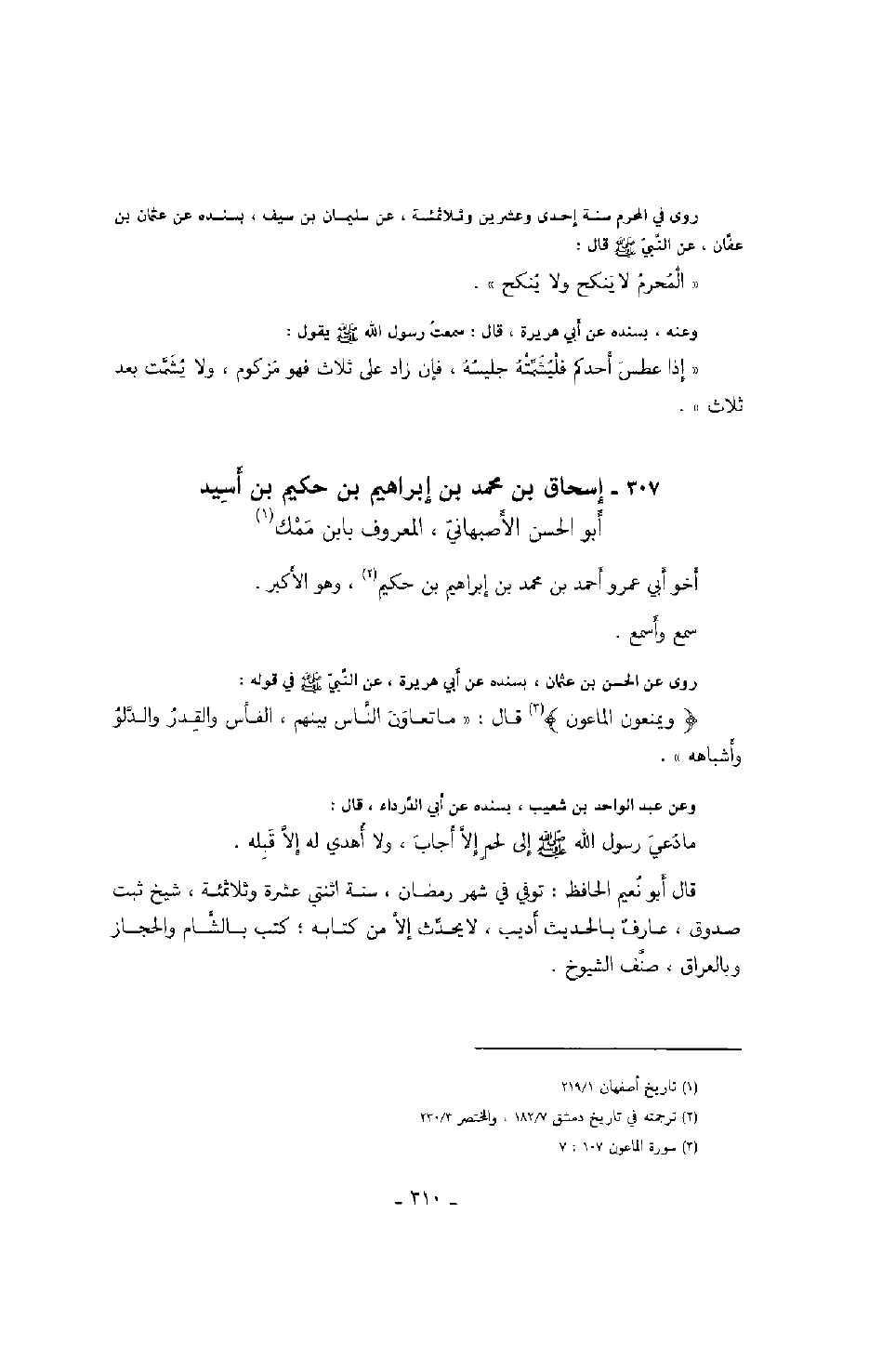 روى في المحرم سنة إحدى وعشرين وثلاثمئة، عن سليمان بن سيف، بسنده عن عثمان بن عفان، عن النبي صَلَّى اللهُ عَلَيْهِ وَسَلَّمَ قال: " المحرم لا يَنكح ولا يُنكح ".