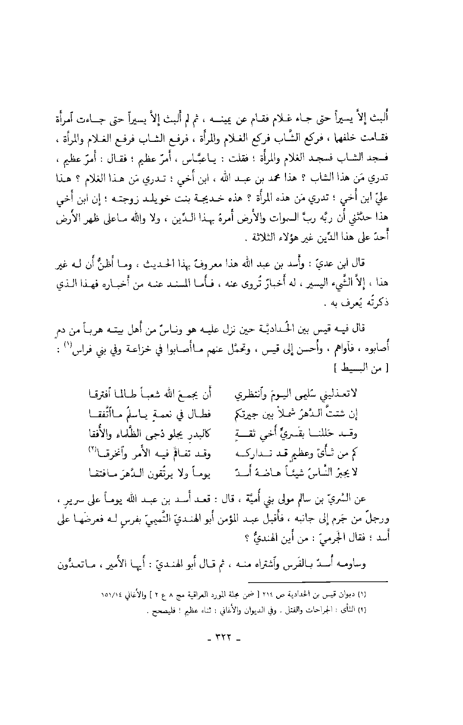 ألبث إلا يسيراً حتى جاء غلام فقام عن يمنه، ثم لم ألبث إلا يسيراً حتى جاءت امرأة فقامت خلفهما، فركع الشاب فركع الغلام والمرأة، فرفع الشاب فرفع الغلام والمرأة، فسجد الشاب فسجد الغلام والمرأة؛ فقلت: يا عباس، أمر عظيم؛ فقال: أمر عظيم، تدري من هذا الشاب؟ هذا محمد بن عبد الله، ابن أخي؛ تدري من هذا الغلام؟ هذا علي ابن أخي؛ تدري من هذه المرأة؟ هذه خديجة بنت خويلد زوجته؛ إن ابن أخي هذا حدثني أن ربه رب السموات والأرض أمره بهذا الدين، ولا والله ما على ظهر الأرض أحد على هذا الدين غير هؤلاء الثلاثة.