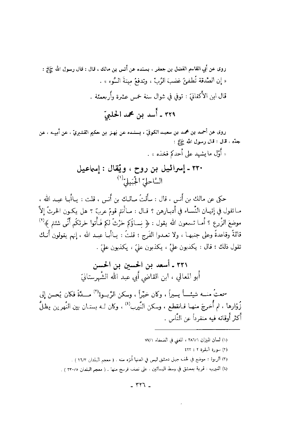 روى عن أبي القاسم الفضل بن جعفر، بسنده عن أنس بن مالك، قال: قال رسول الله صَلَّى اللهُ عَلَيْهِ وَسَلَّمَ: إن الصدقة تطفئ غضب الرب، وتدفع ميتة السوء ".