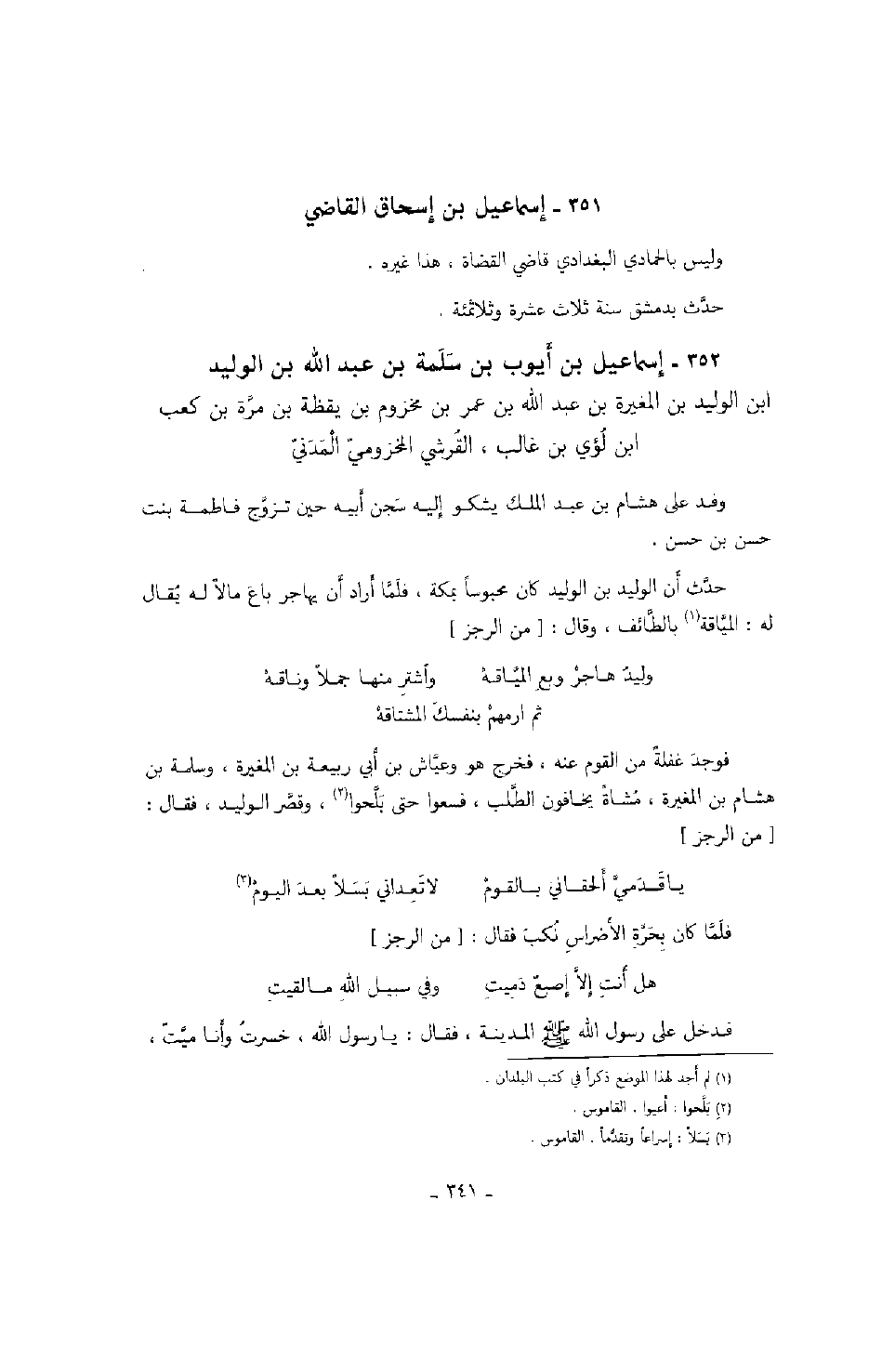 فوجد غفلة من القوم عنه، فخرج هو وعياش بن أبي ربيعة بن المغيرة، وسلمة بن هشام بن المغيرة، مشاة يخافون الطلب، فسعوا حتى بلحوا، وقصر الوليد، فقال: من الرجز