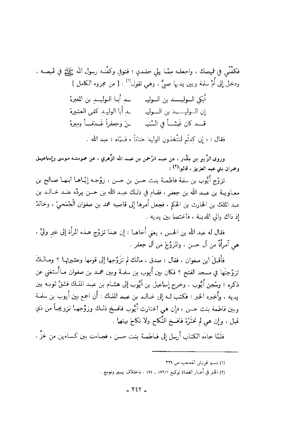 فقال له عبد الله بن الحسن، يعني أخاها: إن هذا تزوج هذه المرأة إلى غير ولي، هي امرأة من آل حسن، والمزوج من آل جعفر.