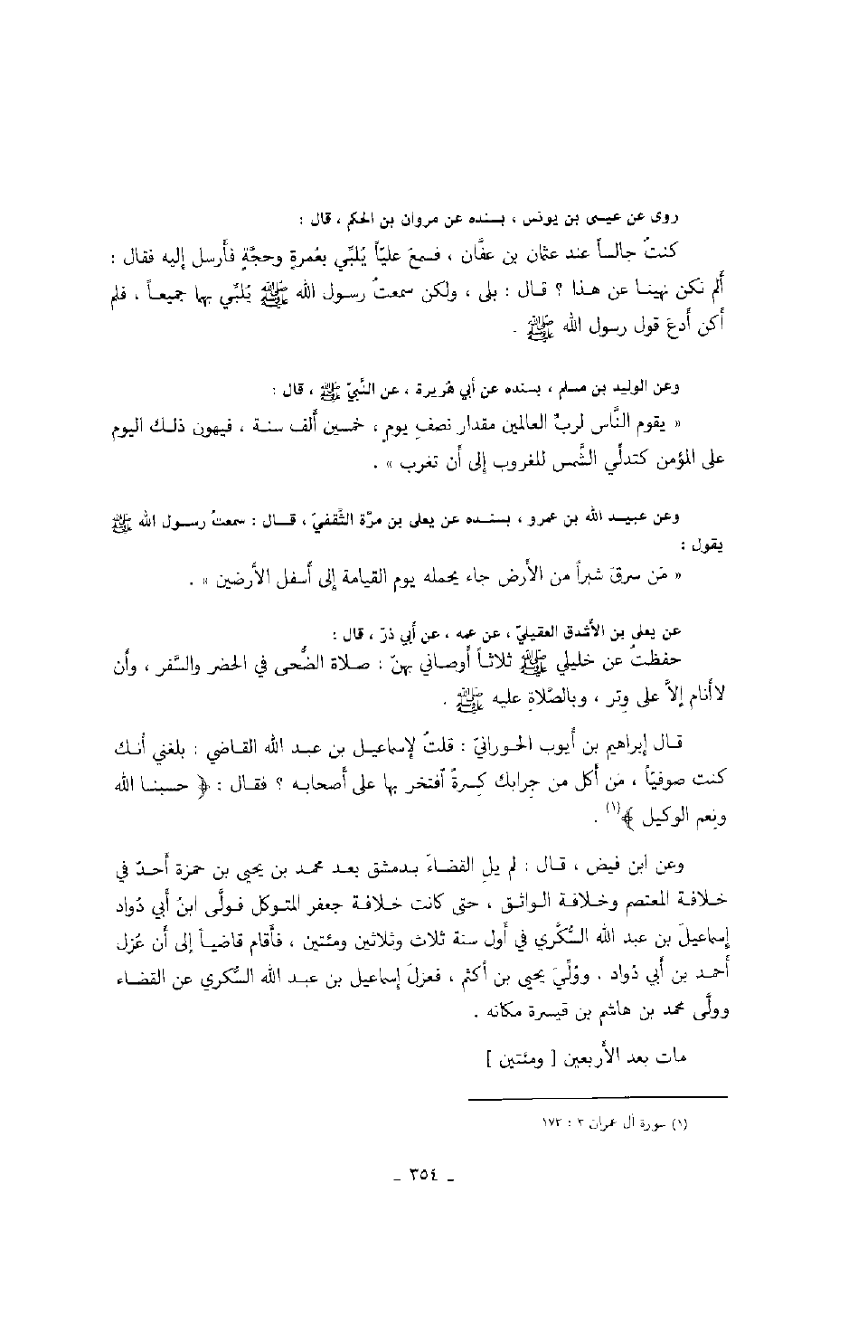 روى عن عيسى بن يونس، بسنده عن مروان بن الحكم، قال: كنت جالساً عند عثمان بن عفان، فسمع علياً يلبي بعمرة وحجة فأرسل إليه فقال: ألم نكن نهينا عن هذا؟ قال: بلى، ولكن سمعت رسول الله صَلَّى اللهُ عَلَيْهِ وَسَلَّمَ يلبي بهما جميعاً، فلم أكن أدع قول رسول الله صَلَّى اللهُ عَلَيْهِ وَسَلَّمَ.