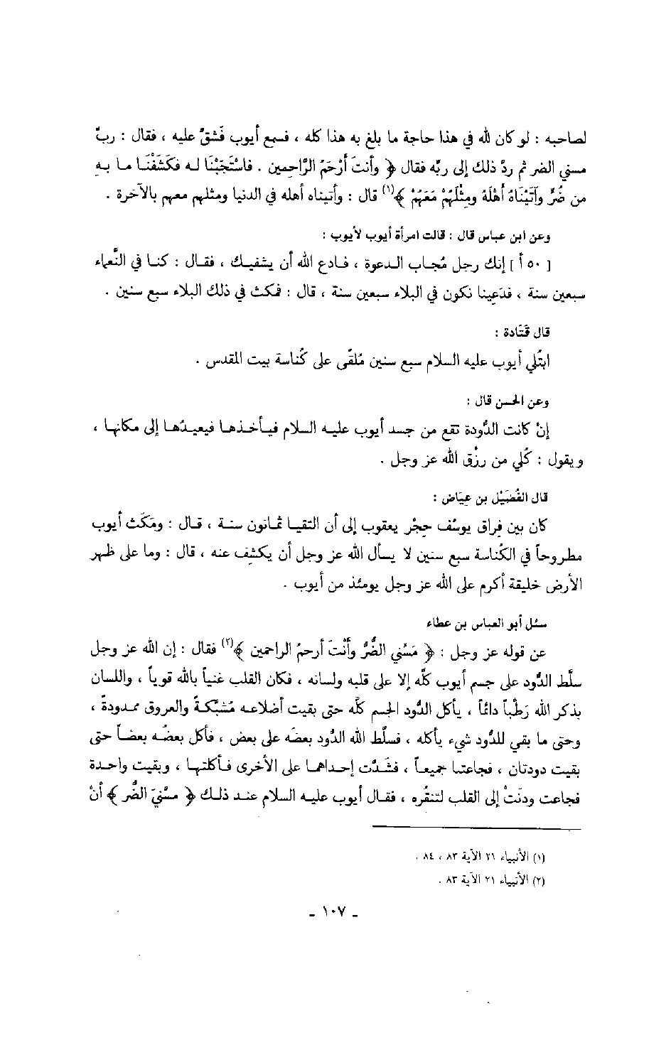 سئل أبو العباس بن عطاء: عن قوله عز وجل: " مسني الضر وأنت أرحم الراحمين " فقال: إن الله عز وجل سلط الدود على جسم أيوب كله إلا على قلبه ولسانه، فكان القلب غنياً بالله قوياً، واللسان بذكر الله رطباً دائماً، يأكل الدود الجسم كله حتى بقيت أضلاعه مشبكةً والعروق ممدودةً، وحتى ما بقي للدود شيئاً يأكله، فسلط الله الدود بعضه على بعض، فأكل بعضه بعضاً حتى بقيت دودتان، فجاعتا جميعاً، فشدت إحداهما على الأخرى فأكلتها، وبقيت واحدة فجاعت ودنت إلى القلب لتنقره، فقال أيوب عليه السلام عند ذلك " مسني الضر " أن
