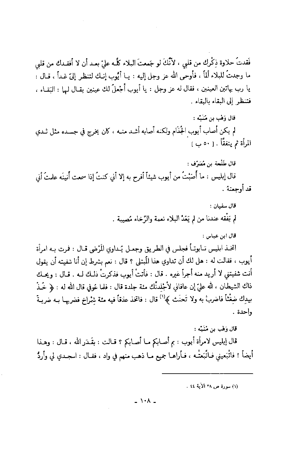 قال طلحة بن مصرف: قال إبليس: ما أصبت من أيوب شيئاً أفرح به إلا أني كنت إذا سمعت أنينه علمت أني قد أوجعته.