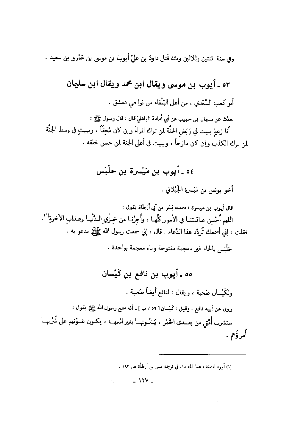 روى عن أبيه نافع - وقيل: كيسان - أنه سمع رسول الله صَلَّى اللهُ عَلَيْهِ وَسَلَّمَ يقول: " ستشرب أمتي من بعدي الخمر، يسمونها بغير اسمها، يكون عونهم على شربها أمراؤهم ".