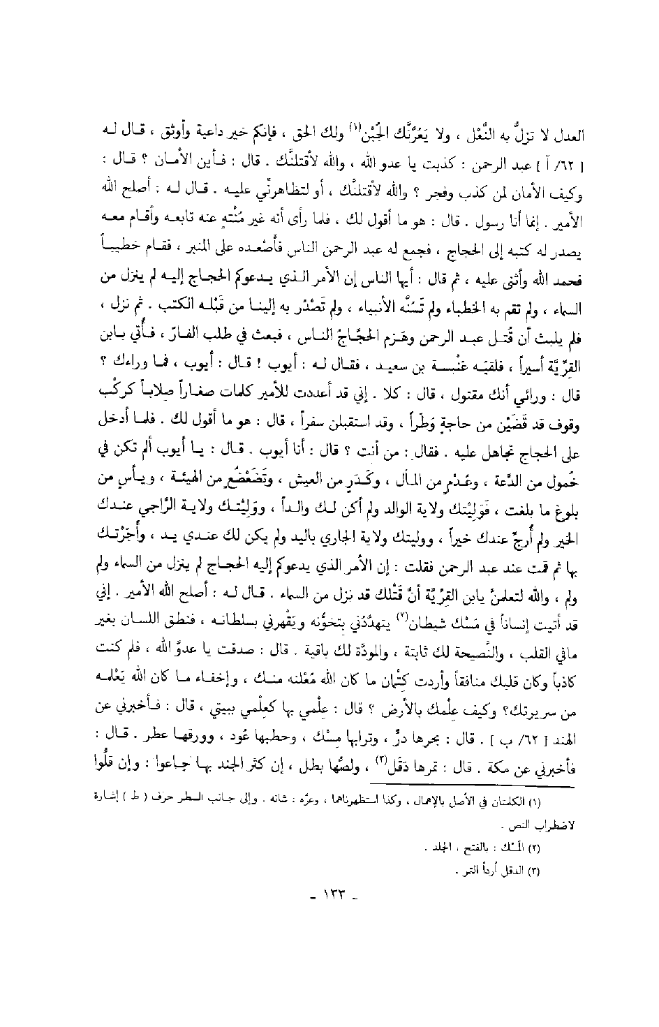 قال: يا أيوب ألم تكن في خمول من الدعة، وعدمٍ من المال، وكدرٍ من العيش، وتضعضعٍ من الهيئة، ويأسٍ من بلوغ ما بلغت، فوليتك ولاية الوالد ولم أكن لك والداً، ووليتك ولاية الراجي عندك الخير ولم أرج عندك خيراً، ووليتك ولاية الجاري باليد ولم يكن عندي يد، وأجرتك بها ثم قمت عند عبد الرحمن فقلت: إن الأمر الذي يدعوكم إليه الحجاج لم ينزل من السماء ولم ولم، والله لتعلمنّ يا بن القرية أن قتلك قد نزل من السماء.