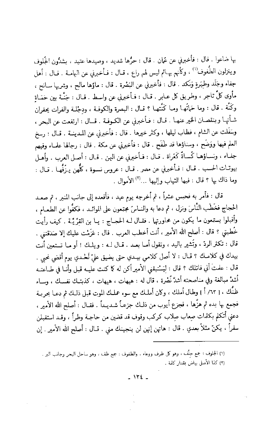 قال: حرها شديد، وصيدها عتيد، يشدون الجلوف وينزلون الطفوف، وكأنهم بهائم ليس لهم راع، قال فأخبرني عن اليمامة. قال: أهل جفاء وطيرة ونكد قال: فأخبرني عن البصرة.