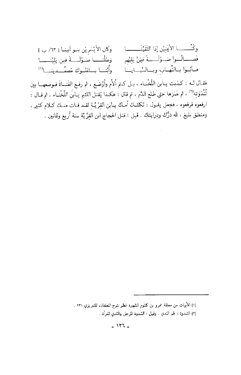 فقال له: كذبت يا بن اللخناء، بل كنتم ألأم وأوضع، ثم رفع القناة فوضعها بين ثندوتة، ثم غمزها حتى طلع الدم، ثم قال: هكذا يقتل اللئيم يا بن اللخناء، ثم قال: ارفعوه فرفعوه، فجعل يقول: ثكلتك أمك يا بن القرية لقد فات منك كلام كثير، ومنطق بليغ، لله درك ودرايتك.