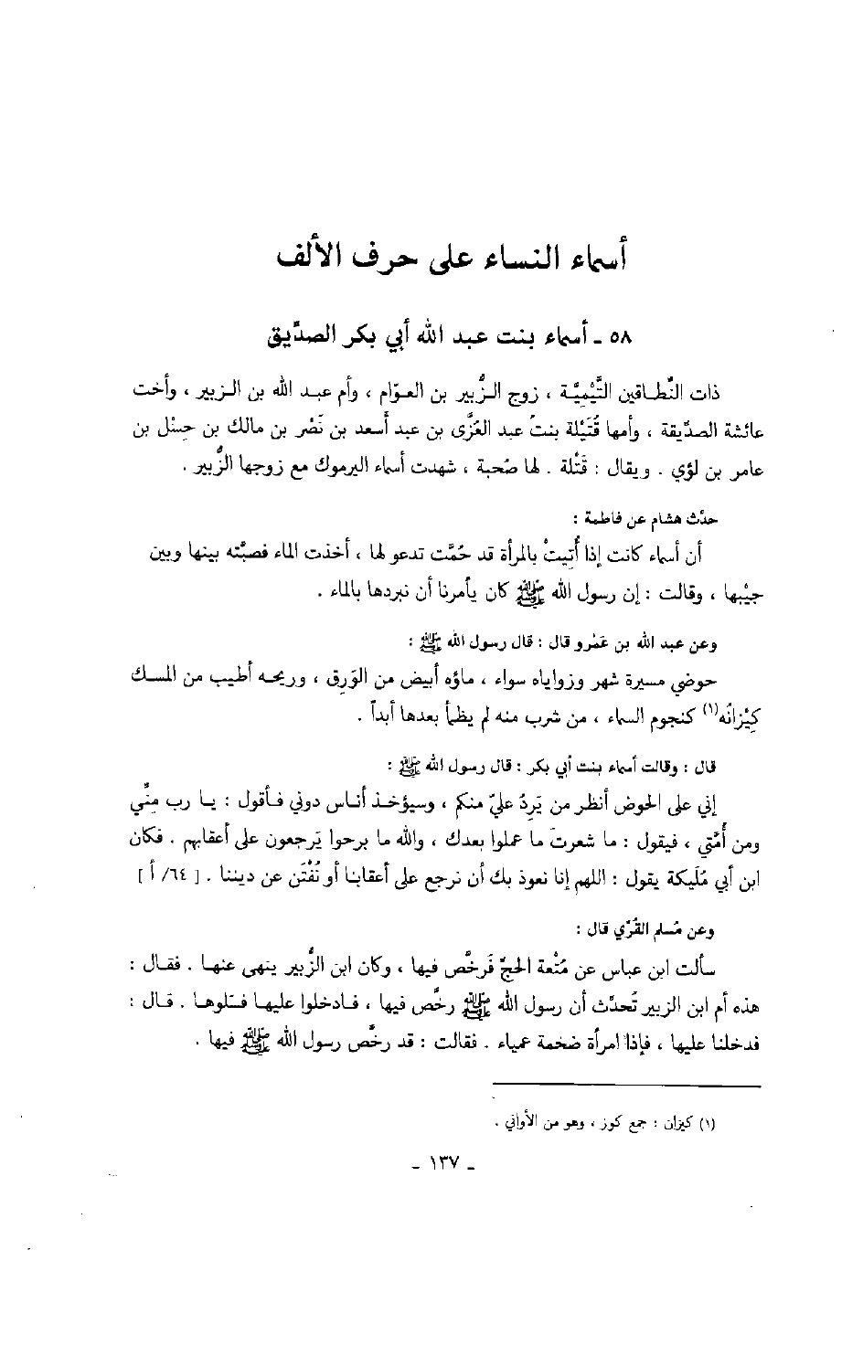 قال: وقالت أسماء بنت أبي بكر: قال رسول الله صَلَّى اللهُ عَلَيْهِ وَسَلَّمَ: " إني على الحوض أنظر من يرد علي منكم، وسيؤخذ أناس دوني فأقول: يا رب مني ومن أمتي، " فيقول: " ما شعرت ما عملوا بعدك، والله ما برحوا يرجعون على أعقابهم ".