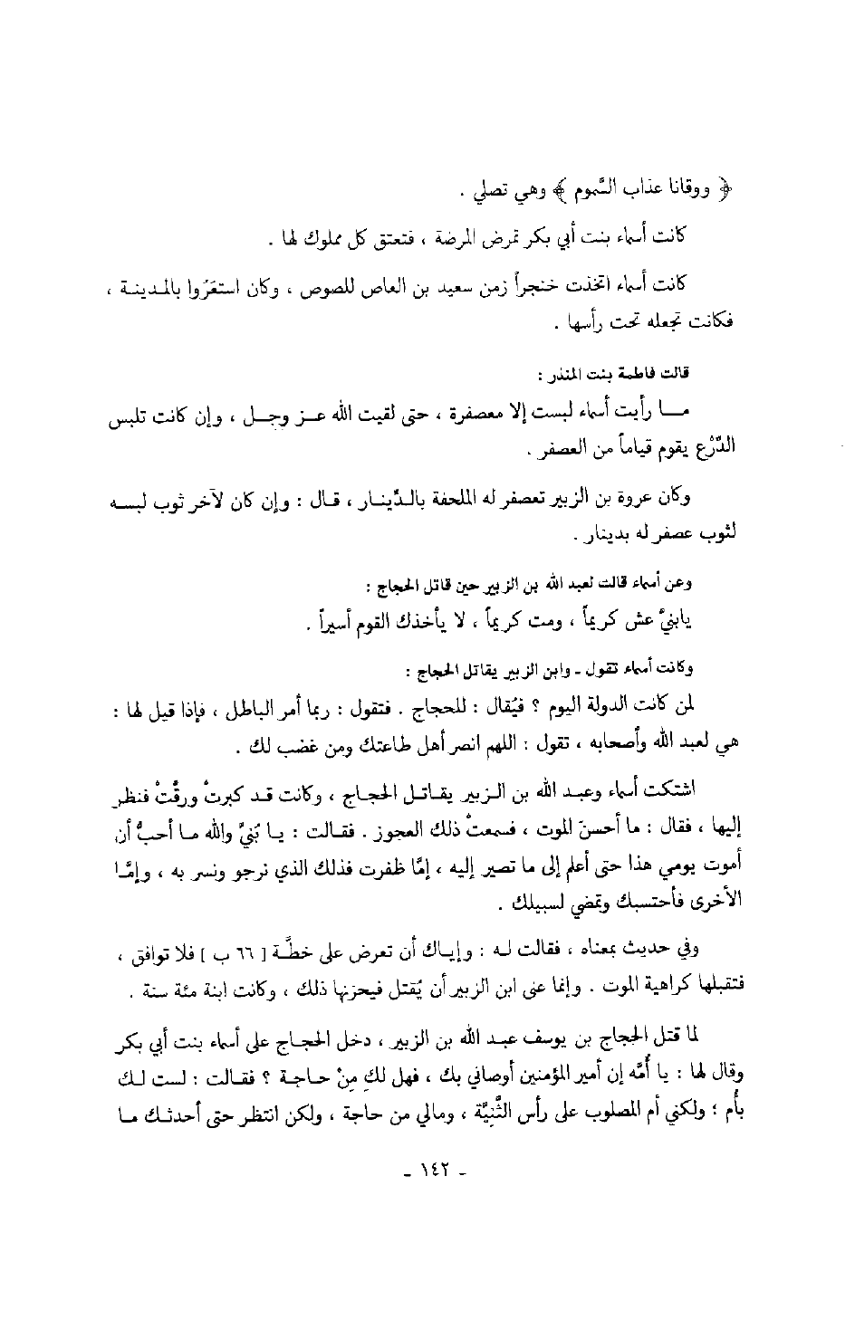 لما قتل الحجاج يوسف بن عبد الله بن الزبير، دخل على أسماء بنت أبي بكر وقال لها: يا أمه إن أمير المؤمنين أوصاني بك، فهل لك من حاجة؟ فقالت: لست لك بأم؛ ولكني أم المصلوب على رأس الثنية، ومالي من حاجة، ولكن انتظر حتى أحدثك ما