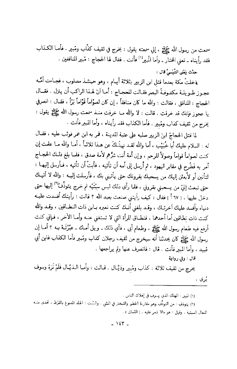 لما قلت الحجاج ابن الزبير صلبه على عتبة المدينة، فمر به ابن عمر فوثب عليه، فقال له: السلام عليك يا أبا خبيب، أما والله لقد نهيتك عن هذا ثلاثاً، أما والله ما علمت إن كنت صواماً قواماً وصولاً للرحم، وإن أمة أنت شرهم لأمة صدق، فلما بلغ ذلك الحجاج أمر به فطرح في مقابر اليهود، ثم أرسل إلى أمه أن تأتيه، فأبت أن تأتيه، فأرسل إليها: لتأتين أو لأبعثن إليك من يسحبك بقرونك حتى يأتيني بك، فأرسلت إليه: والله لا آتيك حتى تبعث إلي من يسحبني بقروني، فلما رأى ذلك لبس سبتيه ثم خرج يتوذف إليها حتى دخل عليها، فقال: كيف رأيتني صنعت بعبد الله؟ قالت: رأيتك أفسدت عليه دنياه، وأفسد عليك آخرتك، وقد بلغني أنك كنت تعيره بابن ذات النطاقين، وقد والله كنت ذات نطاقين أما أحدهما، فنطاق المرأة التي لا تستغني عنه وأما الآخر، فإني كنت أرفع فيه طعام رسول الله صَلَّى اللهُ عَلَيْهِ وَسَلَّمَ، وطعام أبي، فأي ذلك - ويل أمك - عيرته بك؟ أما إن رسول الله صَلَّى اللهُ عَلَيْهِ وَسَلَّمَ كان يحدثنا أنه سيخرج من ثقيف رجلان كذاب ومبير فأما الكذاب فابن أبي عبيد، وأما المبير فأنت.