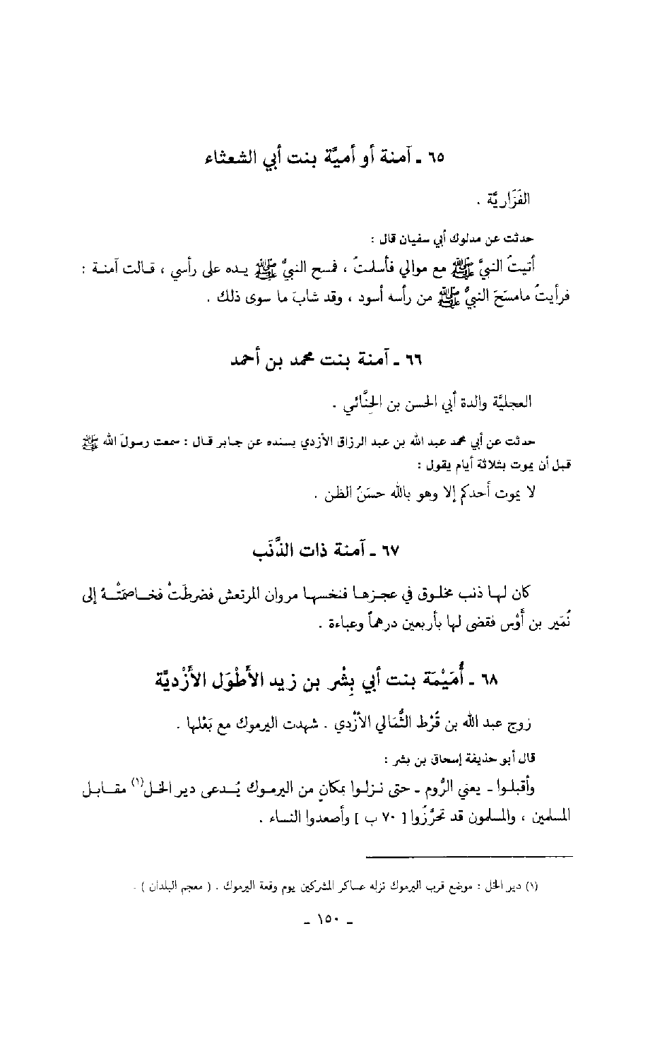 حدثت عن مدلوك أبي سفيان قال: أتيت النبي صَلَّى اللهُ عَلَيْهِ وَسَلَّمَ مع موالي فأسلمت، فمسح النبي صَلَّى اللهُ عَلَيْهِ وَسَلَّمَ يده على رأسي، قالت آمنة: فرأيت ما مسح النبي صَلَّى اللهُ عَلَيْهِ وَسَلَّمَ من رأسه أسود، وقد شاب ما سوى ذلك.