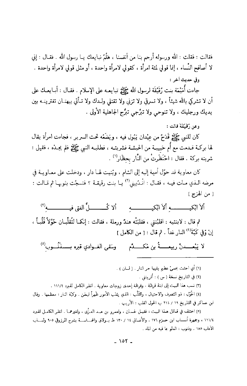 فقال: " إني لا أصافح النساء، إنما قولي لمئة امرأة، كقولي لامرأة واحدة، أو مثل كقولي لامرأة واحدة ".
