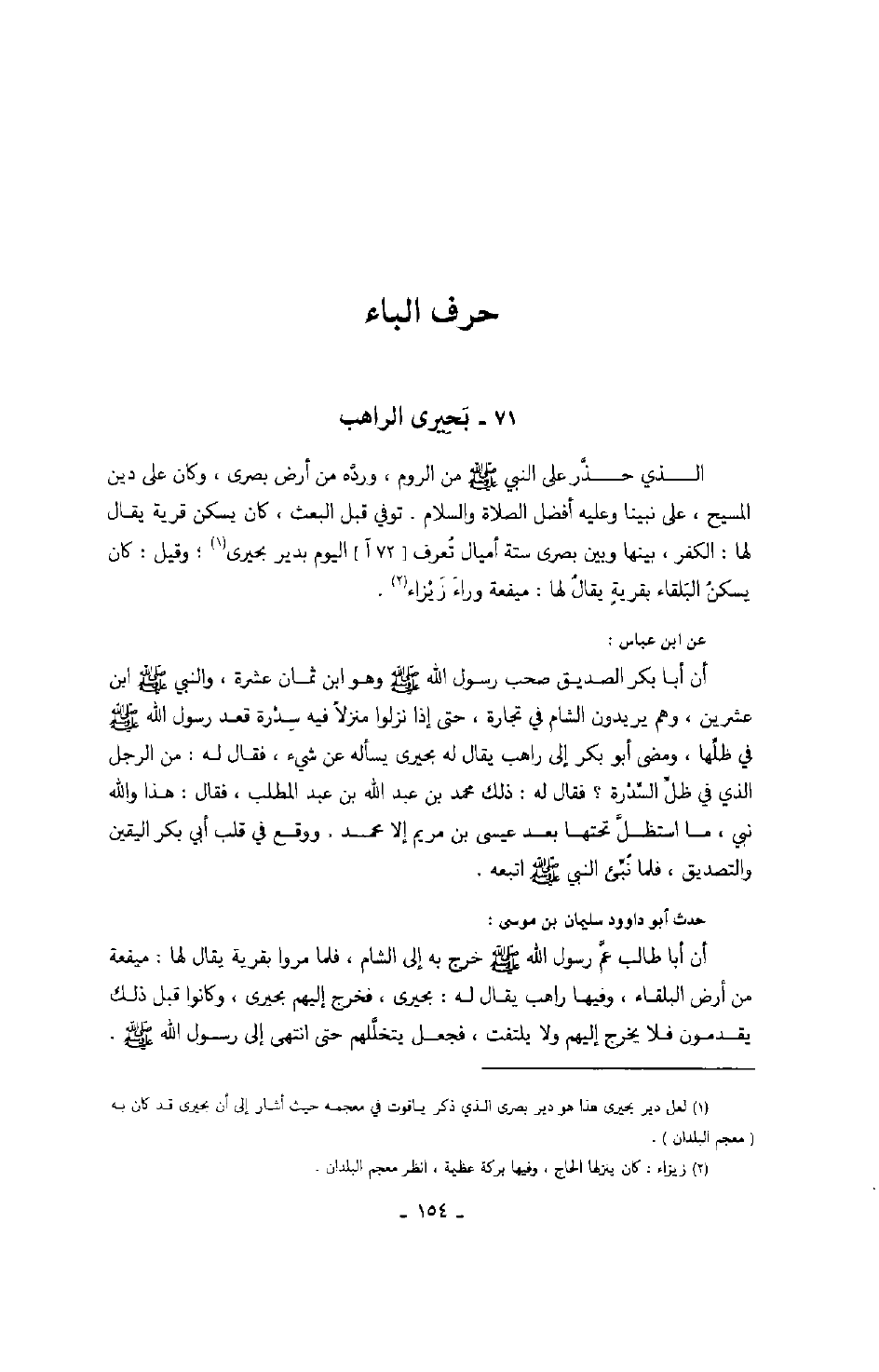 حدث أبو داود سليمان بن موسى: أن أبا طالب عم رسول الله صَلَّى اللهُ عَلَيْهِ وَسَلَّمَ خرج به إلى الشام، فلما مروا بقرية يقال لها: ميفعة من أرض البلقاء، وفيهم راهب يقال له: بحيرى، فخرج إليهم بحيرى، وكانوا قبل ذلك يقدمون فلا يخرج إليهم ولا يلتفت، فجعل يتخللهم حتى انتهى إلى رسول الله صَلَّى اللهُ عَلَيْهِ وَسَلَّمَ.