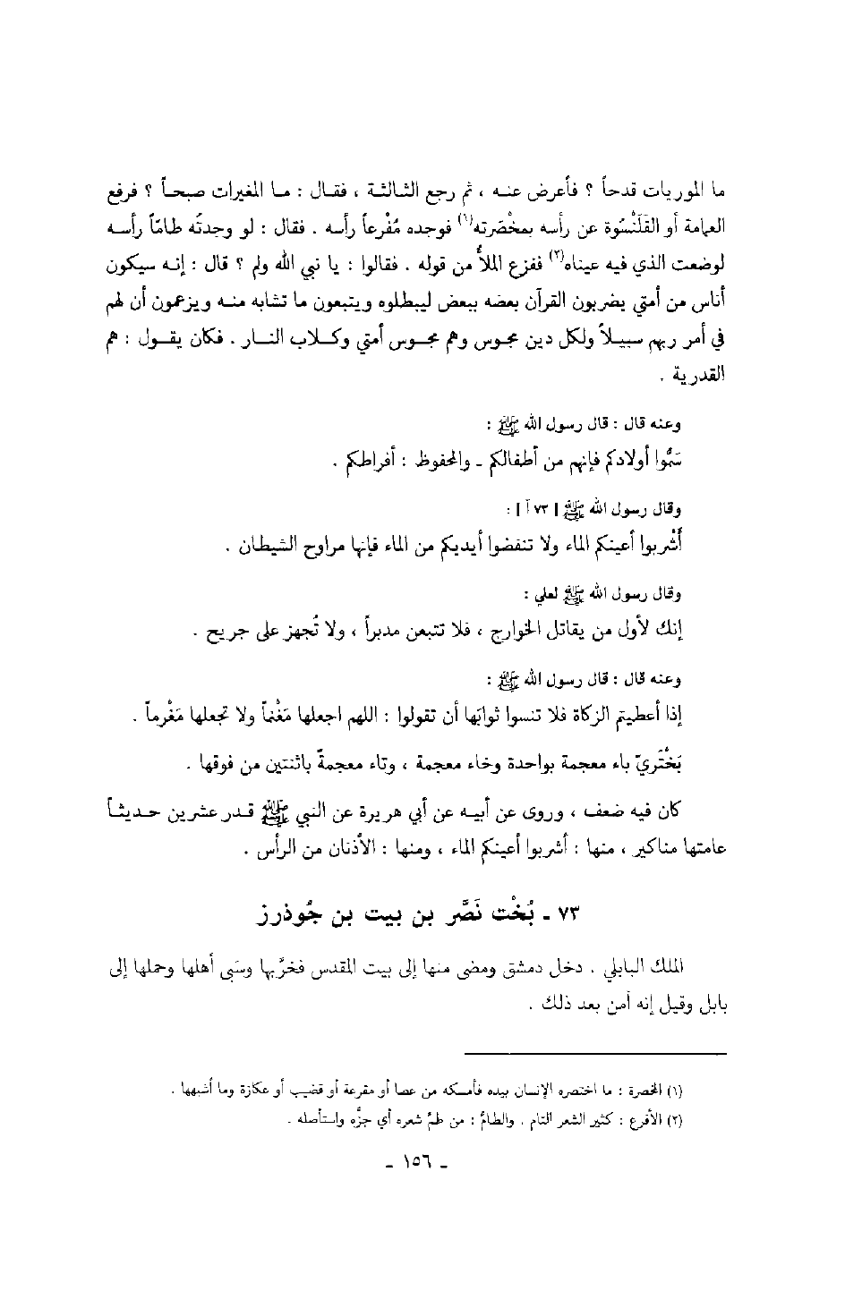 ما الموريات قدحاً؟ فأعرض عنه، ثم رجع الثالثة، فقال: ما المغيرات صبحاً؟ فرفع العمامة أو القلنسوة عن رأسه بمخصرته فوجده مفرعاً رأسه.