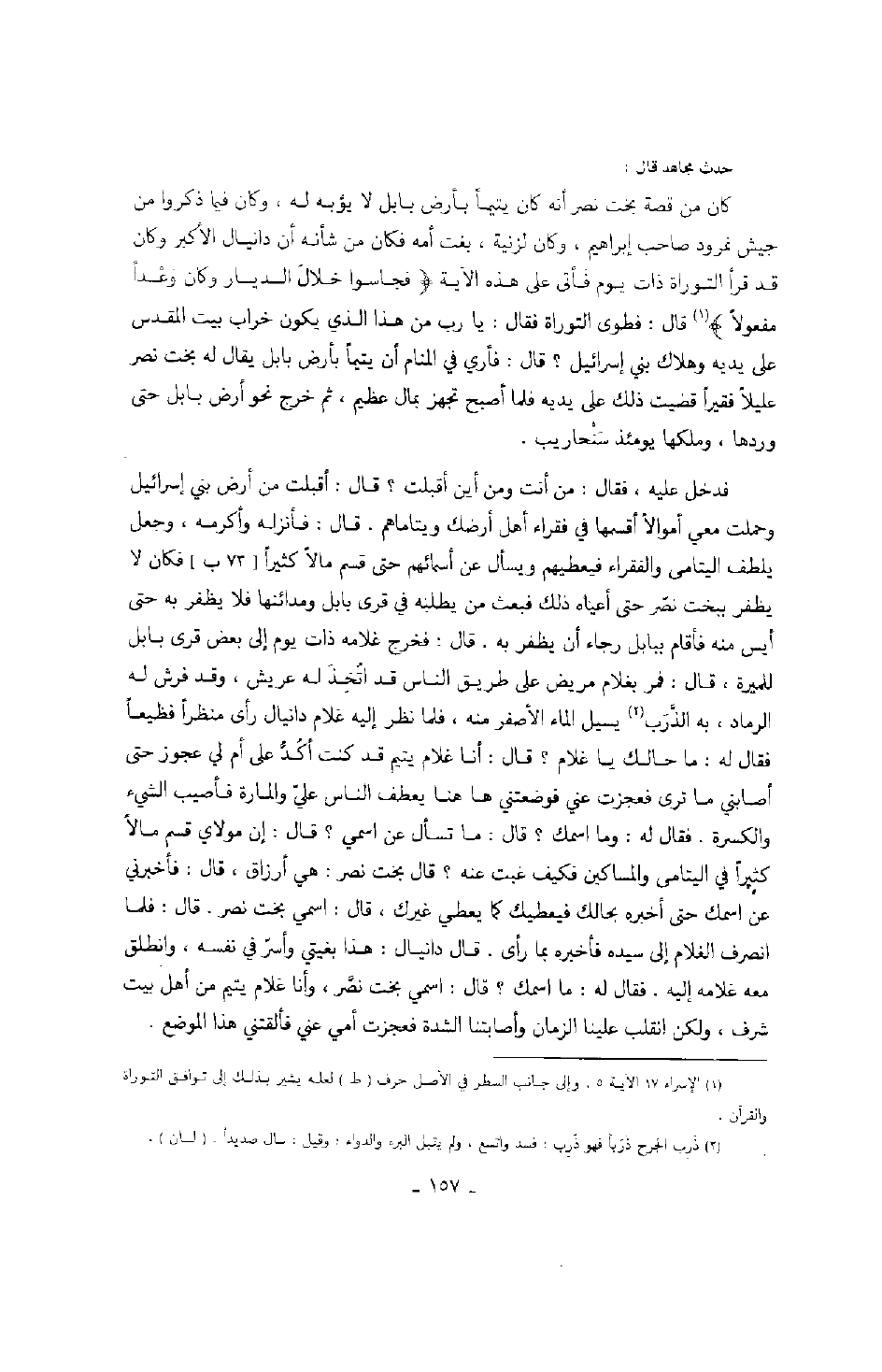حدث مجاهد قال: كان من قصة بخت نصر أنه كان يتيماً بأرض لا يؤبه له، وكان فيما ذكروا من جيش نمرود صاحب إبراهيم، وكان لزنية، بغت أمه فكان من شأنه أن دانيال الأكبر وكان قد قرأ التوراة ذات يوم فأتى على هذه الآية " فجاسوا خلال الديار وكان وعداً مفعولاً " قال: فطوى التوراة فقال: يا رب من هذا المكان الذي يكون خراب بيت المقدس على يديه وهلاك بني إسرائيل؟ قال: فأري في المنام أن يتيماً بأرض بابل يقال له بخت نصر عليلاً فقيراً فقضيت ذلك على يديه فلما أصبح تجهز بمال عظيم، ثم خرج نحو أرض بابل حتى وردها، وملكها يومئذ سنحاريب.
