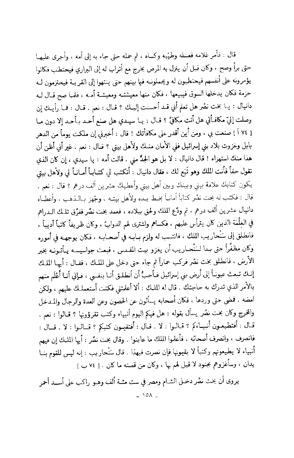 قال: فأمر غلامه فغسله وطيبه وكساه، ثم حمله حتى جاء به إلى أمه، وأجرى عليها حتى برأ وصح، وكان قبل أن ينزل به المرض يخرج مع أتراب له إلى البراري فيحتطب فكانوا يؤمرونه على أنفسهم فيحتطبون له ويحملونه فيما بينهم حتى ينتهوا إلى القرية فيحتزمون له حزمة فكان يدخلها السوق فيبيعها، فكان منها معيشته ومعيشة أمه، فلما صح قال له دانيال: يا بخت نصر هل تعلم أني قد أحسنت إليك؟ قال: نعم.