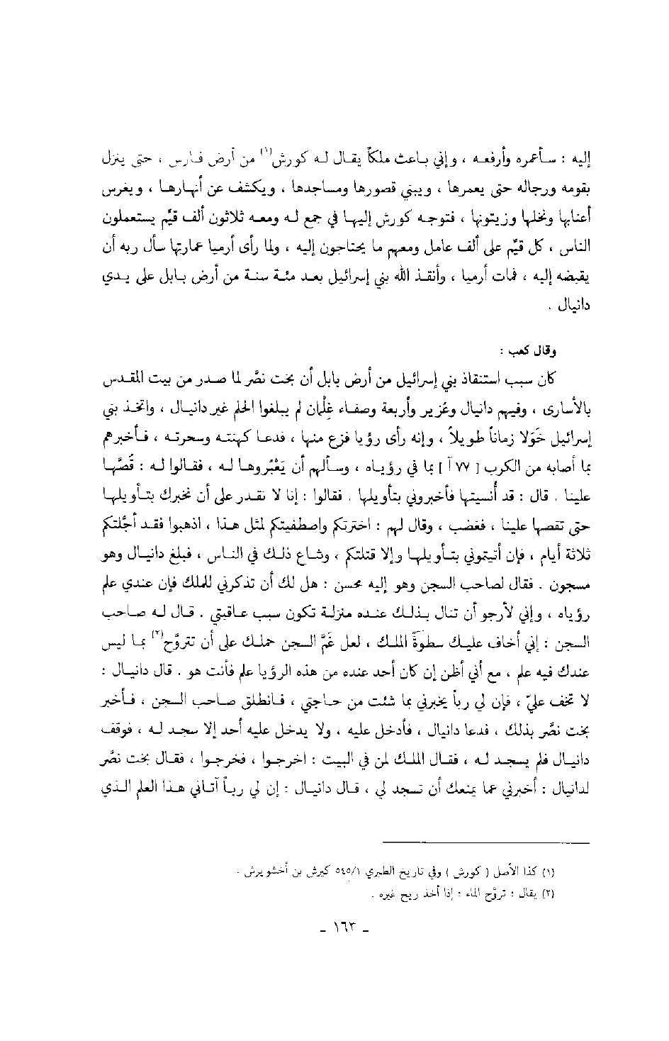وقال كعب: كان سبب إنقاذ بني إسرائيل من بابل أن بخت نصر لما صدر من بيت المقدس بالأسارى، وفيهم دانيال وعزير وأربعة وصفاء غلمان لم يبلغوا الحلم غير دانيال، واتخذ بني إسرائيل خولا زماناً طويلاً، وإنه رأى رؤيا فزع منها، فدعا كهنته وسحرته، فأخبرهم بما أصابه من الكرب بما في رؤياه، وسألهم أن يعبروها له، فقالوا له: قصها علينا.