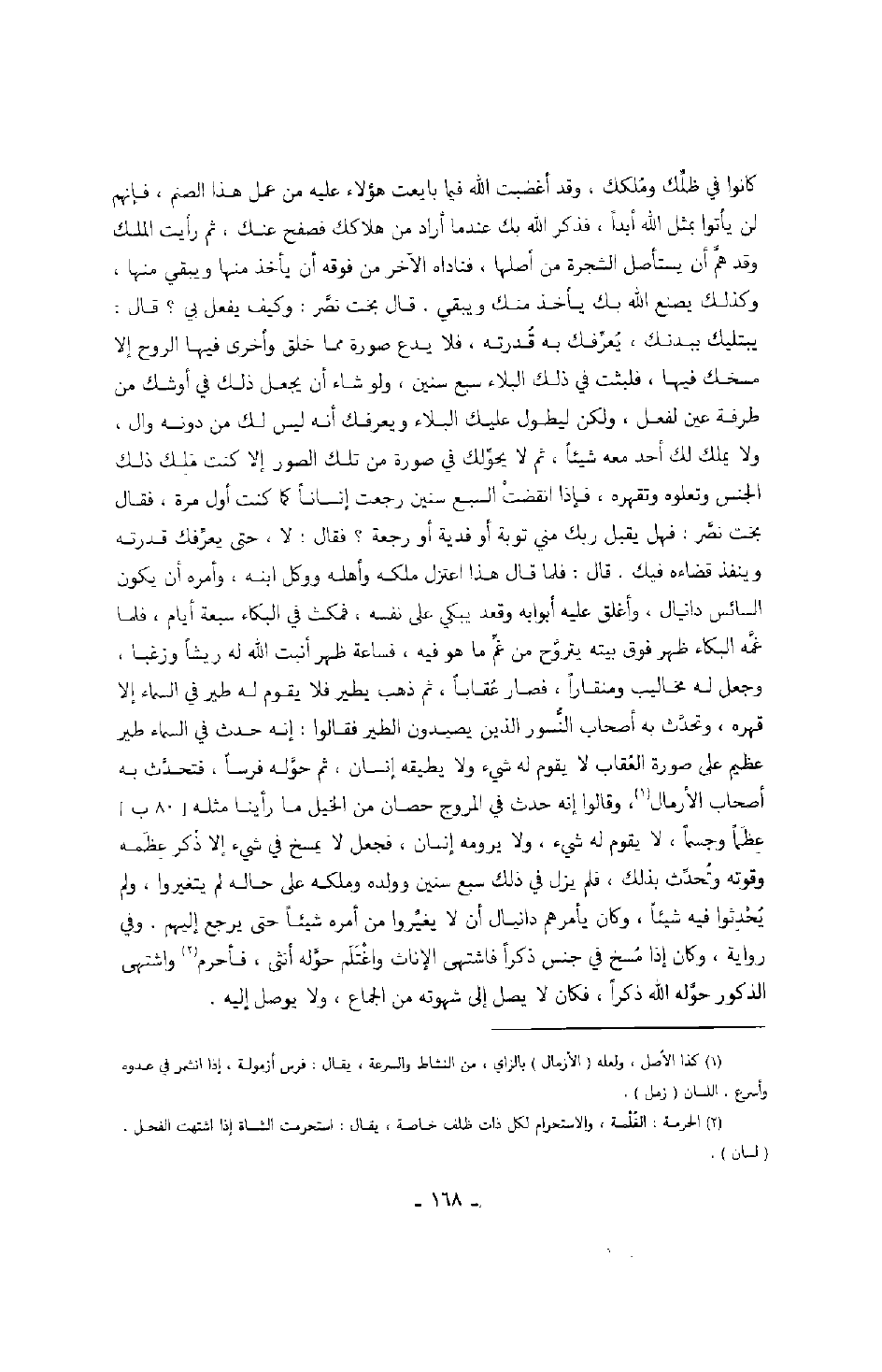 قال: فلما قال هذا اعتزل ملكه وأهله ووكل ابنه، وأمره أن يكون السائس دانيال، وأغلق عليه أبوابه وقعد يبكي على نفسه، فمكث في البكاء سبعة أيام، فلما غمه البكاء ظهر فوق بيته يتروح من غم ما هو فيه، فساعة ظهر أنبت الله له ريشاً وزغباً، وجعل له مخاليب ومنقاراً، فصار عقاباً، ثم ذهب يطير فلا يقوم له طير في السماء إلا قهره، وتحدث به أصحاب النسور الذين يصيدون الطير فقالوا: إنه حدث في السماء طير عظيم على صورة عقاب لا يقوم له شيء ولا يطيقه إنسان، ثم حوله فرساً، فتحدث به أصحاب الأرمال، وقالوا إنه حدث في المروج حصان من الخيل ما رأينا مثله عظماً وجسماً، لا يقوم له شيء، ولا يرومه إنسان، فجعل لا يمسخ في شيء إلا ذكر عظمه وقوته وتحدث بذلك، فلم يزل في ذلك سبع سنين وولده وملكه على حاله لم يتغيروا، ولم يحدثوا فيه شيئاً، وكان يأمرهم دانيال أن لا يغيروا من أمره شيئاً حتى يرجع إليهم.