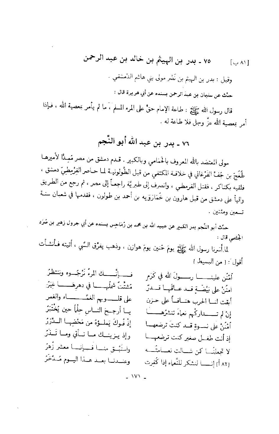 حدث أبو النجم بدر الكبير عن عبيد الله بن محمد بن رماحس بسنده عن أبي جرول زهير بن صرد الجشمي قال: لما أسرنا رسول الله صَلَّى اللهُ عَلَيْهِ وَسَلَّمَ يوم حنين يوم هوازن، وذهب يفرق السبي، أتيته فأنشأت أقول: " من البسيط "