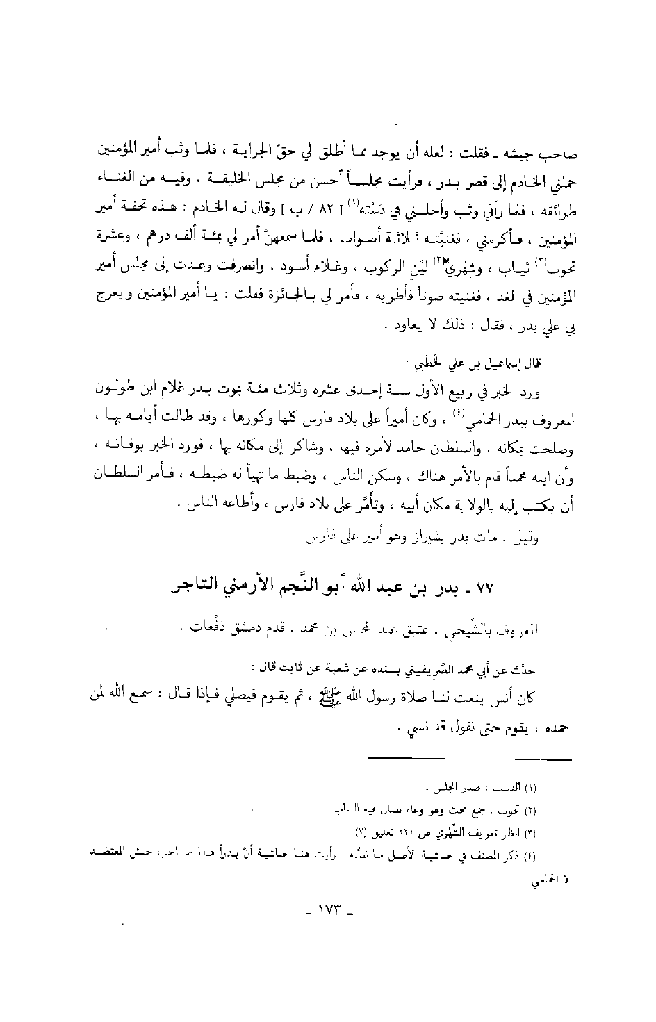 صاحب جيشه - فقلت لعله أن يوجد مما أطلق لي حق الجراية، فلما وثب أمير المؤمنين حملني الخادم إلى قصر بدر، فرأيت مجلساً أحسن من مجلس الخليفة، وفيه من الغناء طرائقه، فلما رآني وثب وأجلسني في دسته وقال له الخادم: هذه تحفة أمير المؤمنين، فأكرمني، فغنيته ثلاثة أصوات، فلما سمعهن أمر بمائة ألف درهم، وعشرة تخوت ثياب، وشهريٍ لين الركوب، وغلام أسود.