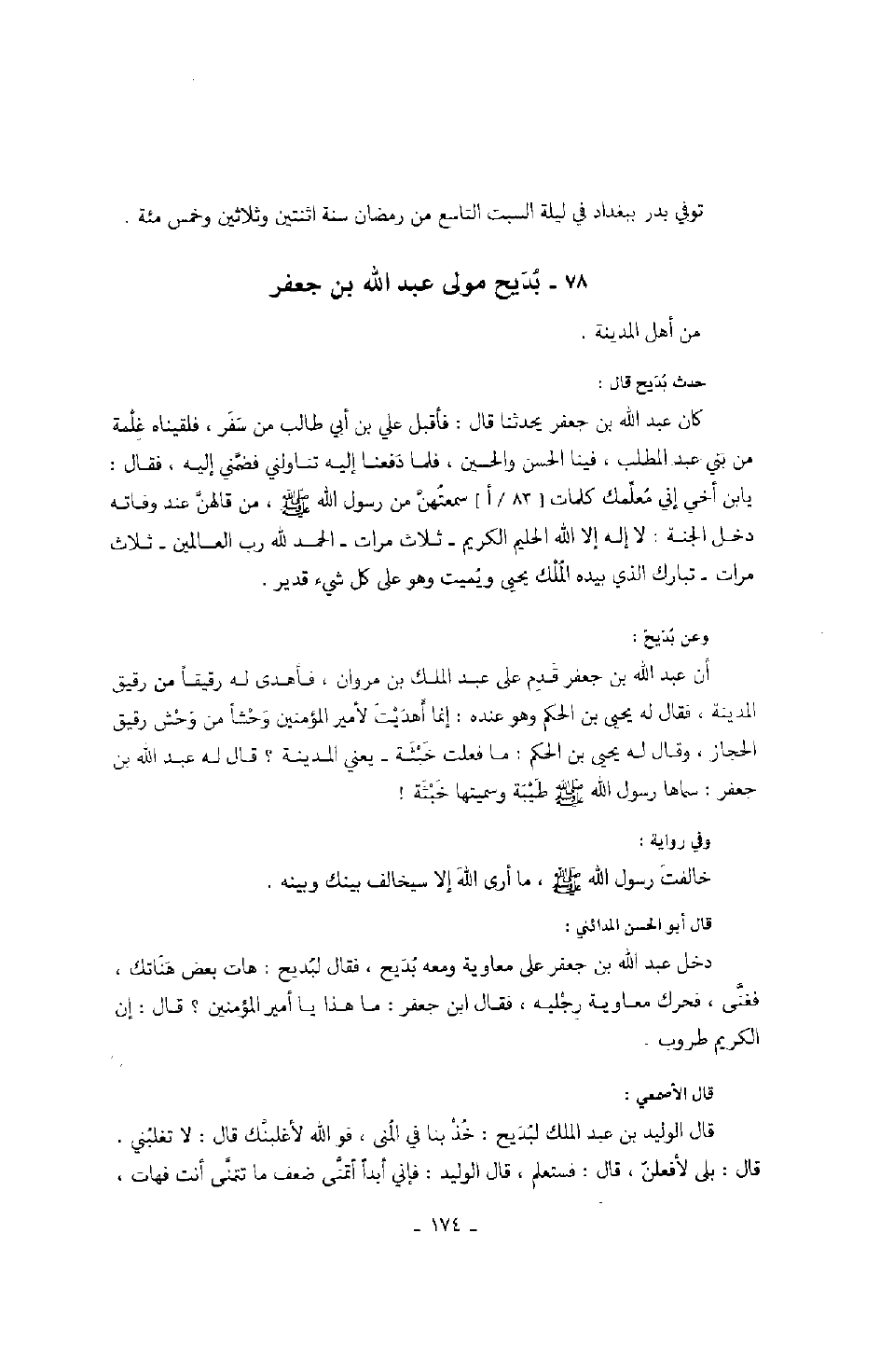 حدث بديح قال: كان عبد الله بن جعفر يحدثنا قال: فأقبل علي بن أبي طالب من سفر، فلقيناه غلمة من بني عبد المطلب، فينا الحسن والحسين، فلما دفعنا إليه تناولني فضمني إليه، فقال: يا بن أخي إني معلمك كلمات سمعتهن من رسول الله صَلَّى اللهُ عَلَيْهِ وَسَلَّمَ، من قالهن عند وفاته دخل الجنة: لا إله إلا الله الحكيم الكريم - ثلاث مرات - الحمد لله رب العالمين - ثلاث مرات - تبارك الذي بيده الملك يحيي ويميت وهو على كل شيء قدير.