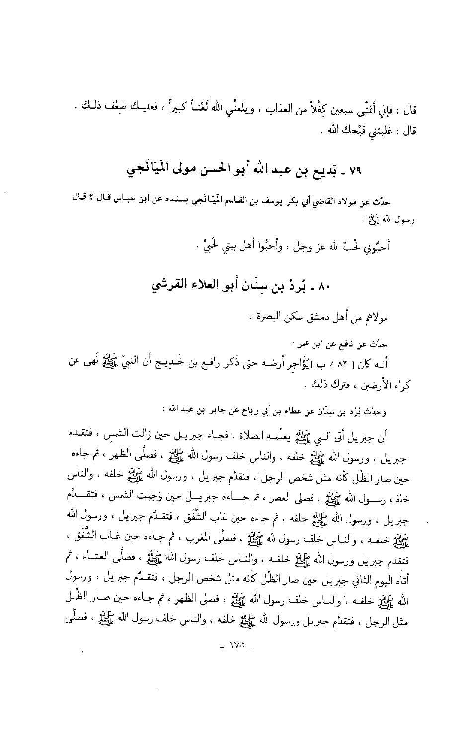 وحدث برد بن سنان عن عطاء بن أبي رباح عن جابر بن عبد الله: أن جبريل أتى النبي صَلَّى اللهُ عَلَيْهِ وَسَلَّمَ يعلمه الصلاة، فجاء جبريل حين زالت الشمس، فتقدم جبريل، ورسول الله صَلَّى اللهُ عَلَيْهِ وَسَلَّمَ خلفه، والناس خلف رسول الله صَلَّى اللهُ عَلَيْهِ وَسَلَّمَ، فصلى الظهر، ثم جاءه حين صار الظل كأنه مثل شخص الرجل، فتقدم جبريل، ورسول الله صَلَّى اللهُ عَلَيْهِ وَسَلَّمَ خلفه، والناس خلف رسول الله صَلَّى اللهُ عَلَيْهِ وَسَلَّمَ، فصلى العصر، ثم جاءه حين غاب الشفق، فتقدم جبريل، ورسول الله صَلَّى اللهُ عَلَيْهِ وَسَلَّمَ خلفه، والناس خلف رسول الله صَلَّى اللهُ عَلَيْهِ وَسَلَّمَ، فصلى المغرب، ثم جاءه حين غاب الشفق، فتقدم جبريل ورسول الله صَلَّى اللهُ عَلَيْهِ وَسَلَّمَ خلفه، والناس خلف رسول الله صَلَّى اللهُ عَلَيْهِ وَسَلَّمَ، فصلى العشاء، ثم أتاه اليوم الثاني جبريل حين صار الظل كأنه مثل شخص الرجل، فتقدم جبريل، ورسول الله صَلَّى اللهُ عَلَيْهِ وَسَلَّمَ خلفه، والناس خلف رسول الله صَلَّى اللهُ عَلَيْهِ وَسَلَّمَ، فصلى الظهر، ثم جاءه حين صار الظل مثل الرجل، فتقدم جبريل ورسول الله صَلَّى اللهُ عَلَيْهِ وَسَلَّمَ خلفه، والناس خلف رسول الله صَلَّى اللهُ عَلَيْهِ وَسَلَّمَ، فصلى