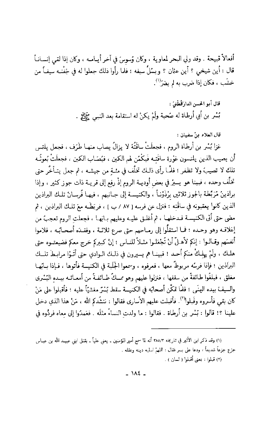 قال العلاء بن سفيان: غزا بسر بن أرطاة الروم، فجعلت ساقته لا يزال يصاب منها طرف، فجعل يلتمس أن يصيب الذين يلتمسون عورة ساقته فيكمن لهم كمين، فيصاب الكمين، فجعلت بعوثه تلك لا تصيب ولا تظفر؛ فلما رأى ذلك تخلف في مائةٍ من جيشه، ثم جعل يتأخر حتى تخاف وحده، فبينا هو يسير في بعض أودية الروم إذ رفع إلى قرية ذات جوز كثير، وإذا براذين مربطة بالجوز ثلاثين برذوناً، والكنيسة إلى جانبهم، فيها فرسان تلك البراذين الذين كانوا يعقبونه في ساقته؛ فنزل عن فرسه فربطه مع تلك البراذين، ثم مضى حتى أتى الكنيسة فدخلها، ثم أغلق عليه وعليهم بابها، فجعلت الروم تعجب من إغلاقه وهو وحده؛ فما استقلوا إلى رماحهم حتى صرع ثلاثة، وفقده أصحابه، فلاموا أنفسهم وقالوا: إنكم لأهلٌ أن تجعلوا مثلاً للناس؛ إن كبيركم خرج معكم فضيعتموه حتى هلك، ولم يهلك منكم أحد! فبينا هم يسيرون في ذلك الوادي حتى أتوا مرابط تلك البراذين؛ فإذا فرسه مربوطٌ معها، فعرفوه، وسمعوا الجلبة في الكنيسة فأتوها، فإذا بابها مغلق، فبلغوا طائفةً من سقفها، فنزلوا عليهم وهو ممسكٌ طائفةً من أمعائه بيده اليسرى والسيف بيده اليمنى؛ فلما تمكن أصحابه في الكنيسة سقط بسر مغشياً عليه؛ فأقبلوا على من كان بقي فأسروه وقبلوا.
