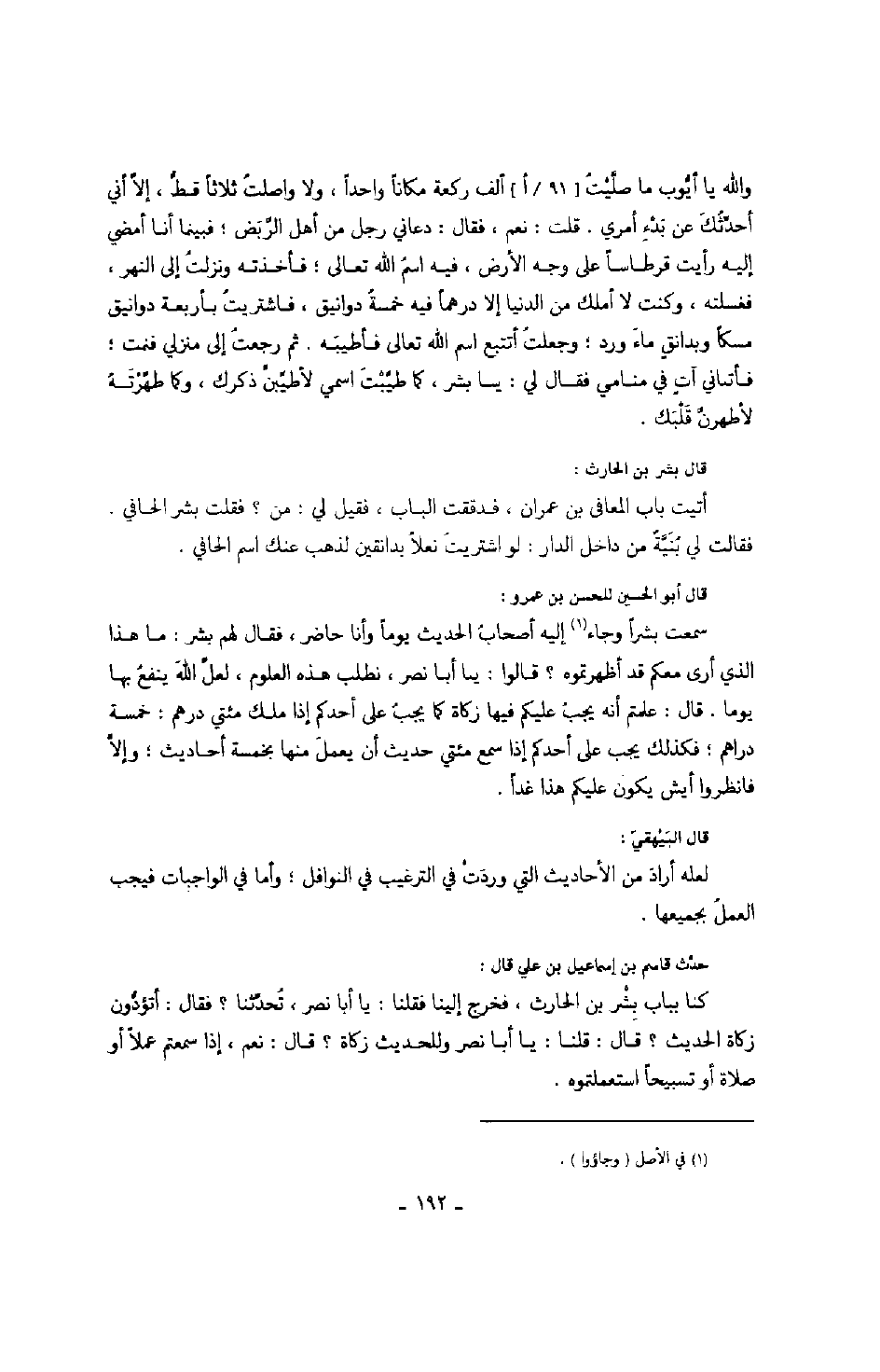 حدث قاسم بن إسماعيل بن علي قال: كنا بباب بشر بن الحارث، فخرج إلينا فقلنا: يا أبا نصر، تحدثنا؟ فقال: أتؤدون زكاة الحديث؟ قال: قلنا: يا أبا نصر وللحديث زكاة؟ قال: نعم، إذا سمعتم عملاً أو صلاة أو تسبيحاً استعملوه.