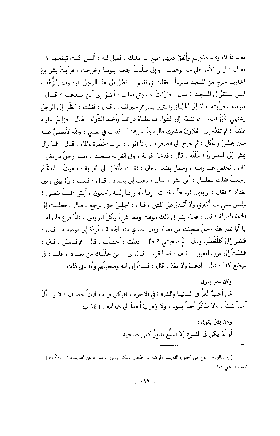 قال: فقلت: انظر إلى الرجل يشتهي خبز الماء! ثم تقدم إلى الشواء فأعطاه درهماً وأخذ الشواء. قال: فزادني عليه غيظاً! ثم تقدم إلى الحلاوي فاشترى فالوذجاً بدرهم.