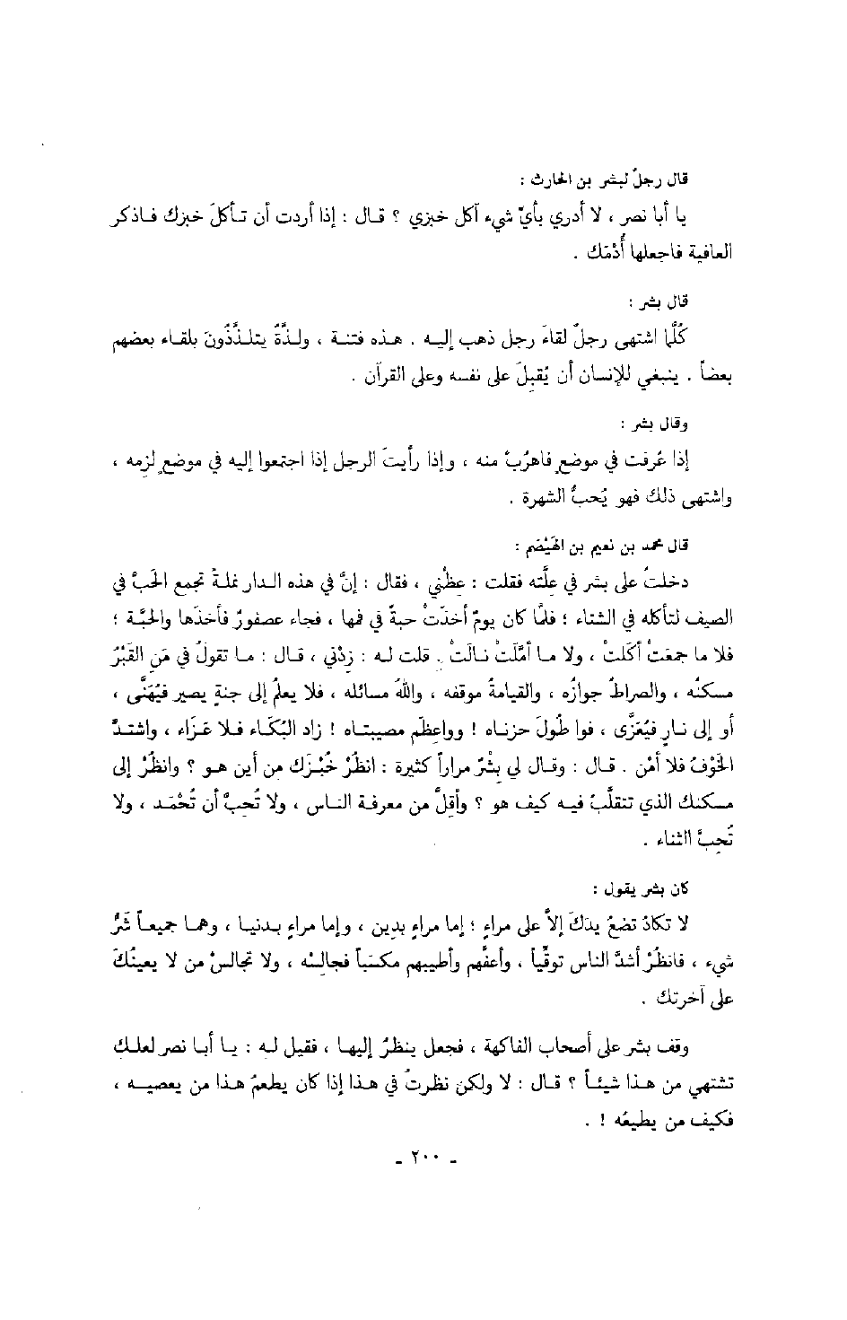 قال: وقال لي بشرٌ مراراً كثيرة: انظر خبزك من أين هو؟ وانظر إلى مسكنك الذي تتقلب فيه كيف هو؟ وأقل من معرفة الناس، ولا تحب أن تحمد، ولا تحب الثناء.