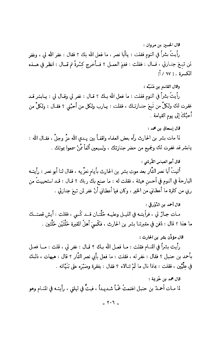 قال الحسين بن مروان: رأيت بشراً في النوم فقلت: يا أبا نصر، ما فعل الله بك؟ فقال: غفر الله لي، وغفر لمن تبع جنازتي، قال: فقلت: ففيم العمل؟ فأخرج كسرةً ثم قال: انظر في هذه الكسرة.