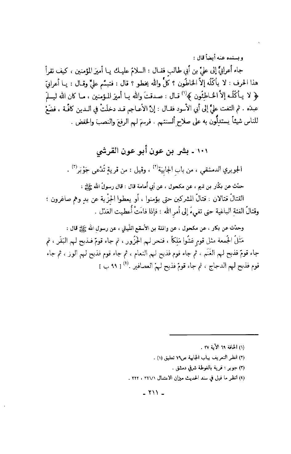 وبسنده عنه أيضاً قال: جاء أعرابيٌّ إلى علي بن أبي طالب فقال: السلام عليك يا أمير المؤمنين، كيف نقرأ هذا الحرف: لا يأكله إلا الخاطون؟ كلٌّ والله يخطو؟ قال: فتبسم عليٌّ وقال: يا أعرابي " لا يأكله إلا الخاطئون " قال: صدقت والله يا أمير المؤمنين، ما كان الله ليسلم عبده.