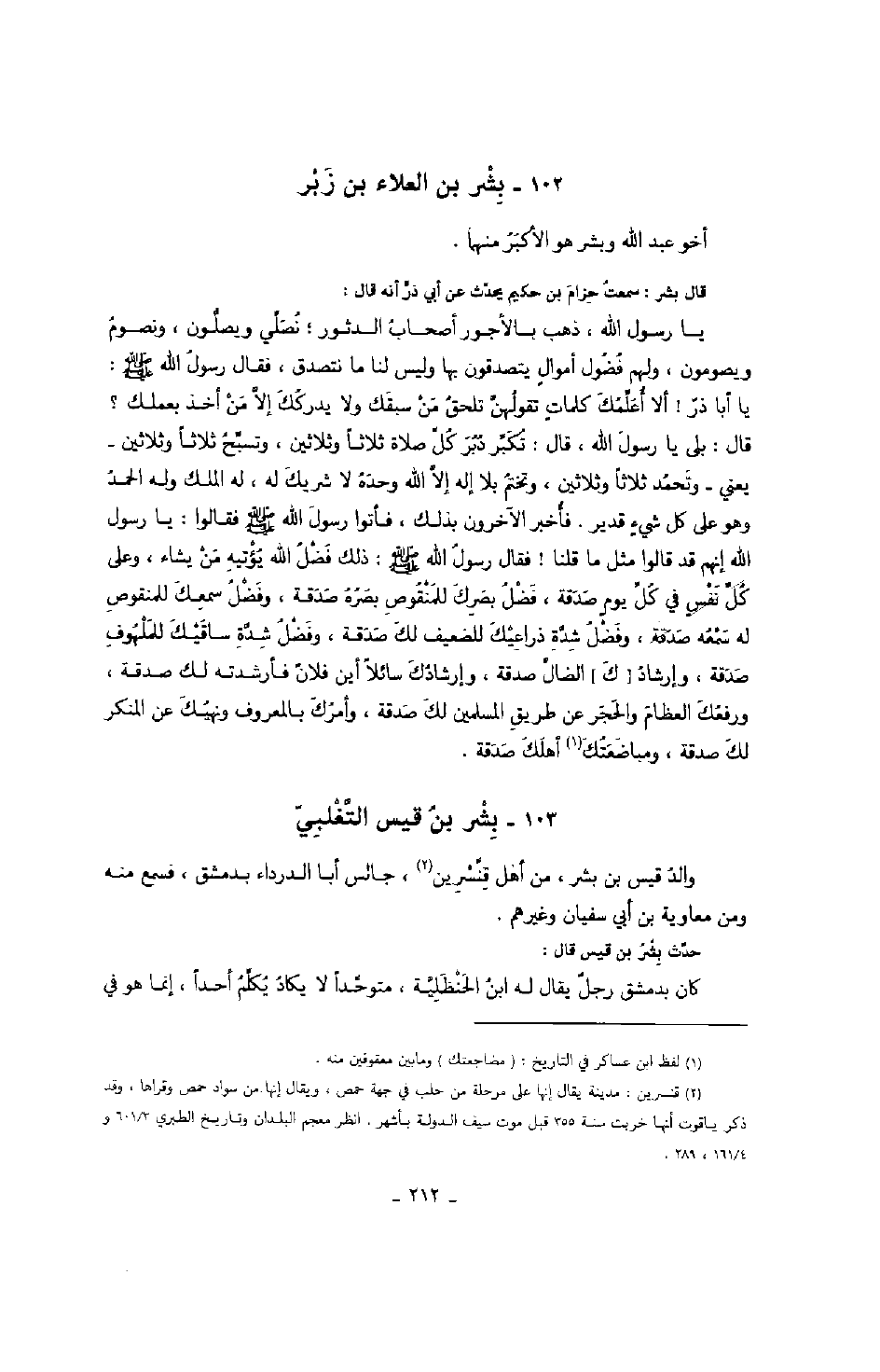 قال بشر: سمعت حزام بن حكيم يحدث عن أبي ذر أنه قال: يا رسول الله، ذهب بالأجور أصحاب الدثور؛ نصلي ويصلون، ونصوم ويصومون، ولهم فضول أموالٍ يتصدقون بها وليس لنا ما نتصدق، فقال رسول الله صَلَّى اللهُ عَلَيْهِ وَسَلَّمَ: " يا أبا ذر! ألا أعلمك كلماتٍ تقولهن تلحق من سبقك ولا يدركك إلا من أخذ بعلمك؟ " قال: بلى يا رسول الله، قال: " تكبر دبر كل صلاة ثلاثاً وثلاثين، وتسبح ثلاثاً وثلاثين - يعني - وتحمد ثلاثاً وثلاثين، وتختم بلا إله إلا الله وحده لا شريك له، له الملك وله الحمد وهو على كل شيءٍ قدير ".