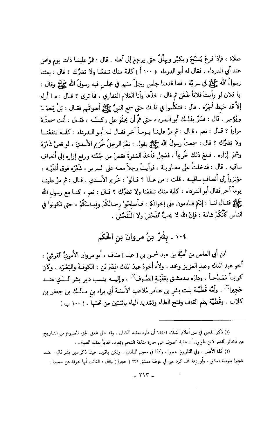 قال: ثم مر علينا يوماً آخر فقال أبو الدرداء: كلمة منك تنفعنا ولا تضرك؟ قال: نعم، كنا مع رسول الله صَلَّى اللهُ عَلَيْهِ وَسَلَّمَ فقال لنا: " إنكم قادمون على إخوانكم، فأصلحوا رحالكم ولباسكم، حتى تكونوا في الناس كأنكم شامة؛ فإن الله لا يحب الفحش ولا التفحش ".