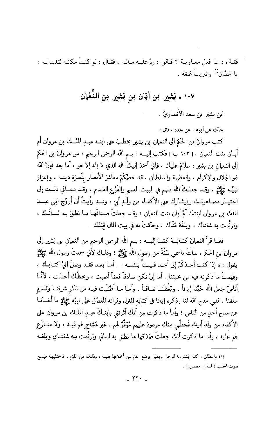 حدث عن أبيه، عن جده، قال: كتب مروان بن الحكم إلى النعمان بن بشير يخطب على ابنه عبد الملك بن مروان أم أبان بنت النعمان، فكتب إليه: بسم الله الرحمن الرحيم، من مروان بن الحكم إلى النعمان بن بشير، سلامٌ عليك، فإني أحمد إليك الله الذي لا إله إلا هو، أما بعد فإن الله ذو الجلال والإكرام، والعظمة والسلطان، قد خصكم معاشر الأنصار بنصرة دينه، وإعزاز نبيه صَلَّى اللهُ عَلَيْهِ وَسَلَّمَ، وقد جعلك الله منهم في البيت العميم والفرع القديم، وقد دعاني ذلك إلى اختيار مصاهرتك وإيثارك على الأكفاء من ولد أبي؛ وقد رأيت أن أزوج ابني عبد الملك بن مروان ابنتك أم أبان بنت النعمان؛ وقد جعلت صداقها ما نطق به لسانك، وترنمت به شفتاك، وبلغه مناك، وحكمت به في بيت المال قبلك.