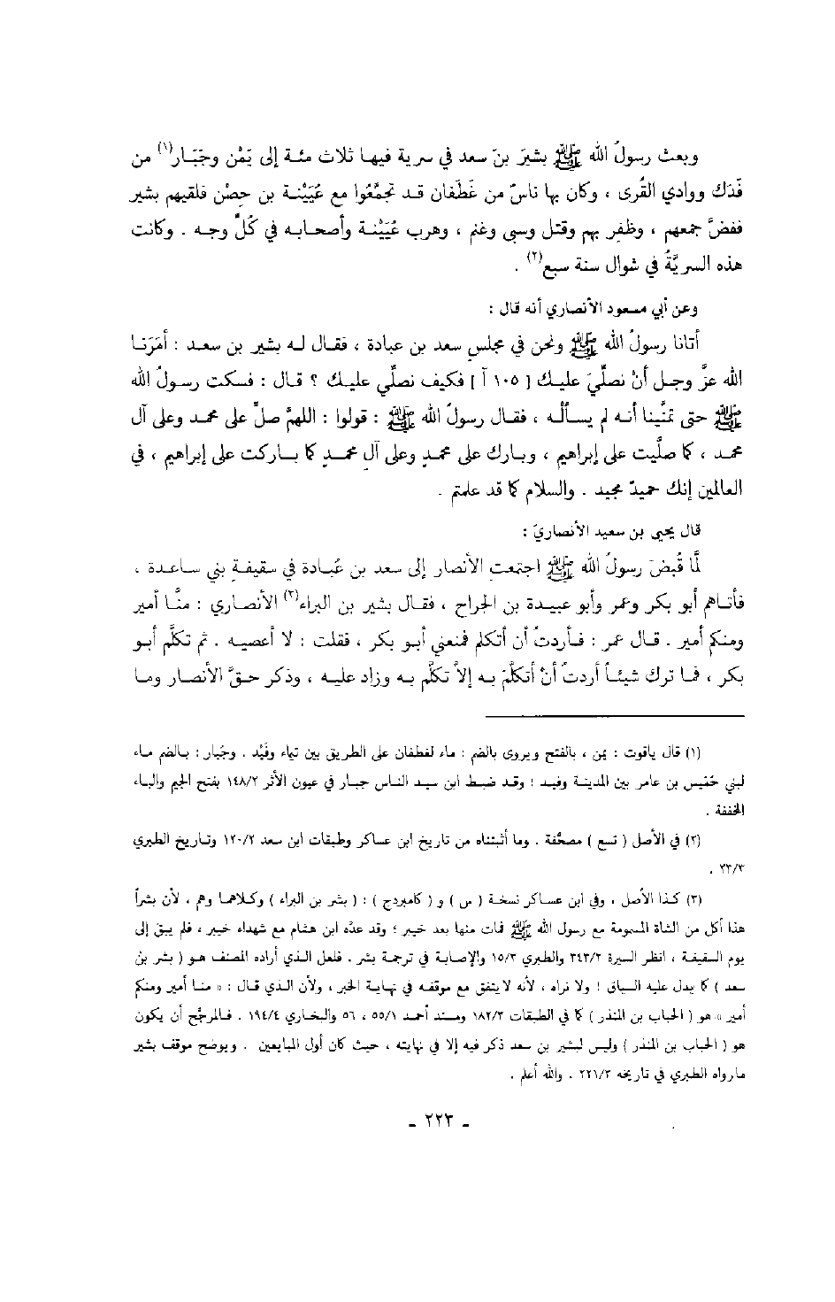 وعن أبي مسعود الأنصاري أنه قال: أتانا رسول الله صَلَّى اللهُ عَلَيْهِ وَسَلَّمَ ونحن في مجلس سعد بن عبادة، فقال له بشير بن سعد: أمرنا الله عز وجل أن نصلي عليك فكيف نصلي عليك؟ قال: فسكت رسول الله صَلَّى اللهُ عَلَيْهِ وَسَلَّمَ حتى تمنينا أنه لم يسأله، فقال رسول الله صَلَّى اللهُ عَلَيْهِ وَسَلَّمَ: " قولوا: اللهم صلي على محمد وعلى آل محمد، كما صليت على إبراهيم، وبارك على محمدٍ وعلى آل محمدٍ كما باركت على إبراهيم، في العالمين إنك حميدٌ مجيد. والسلام كما قد علمتم ".