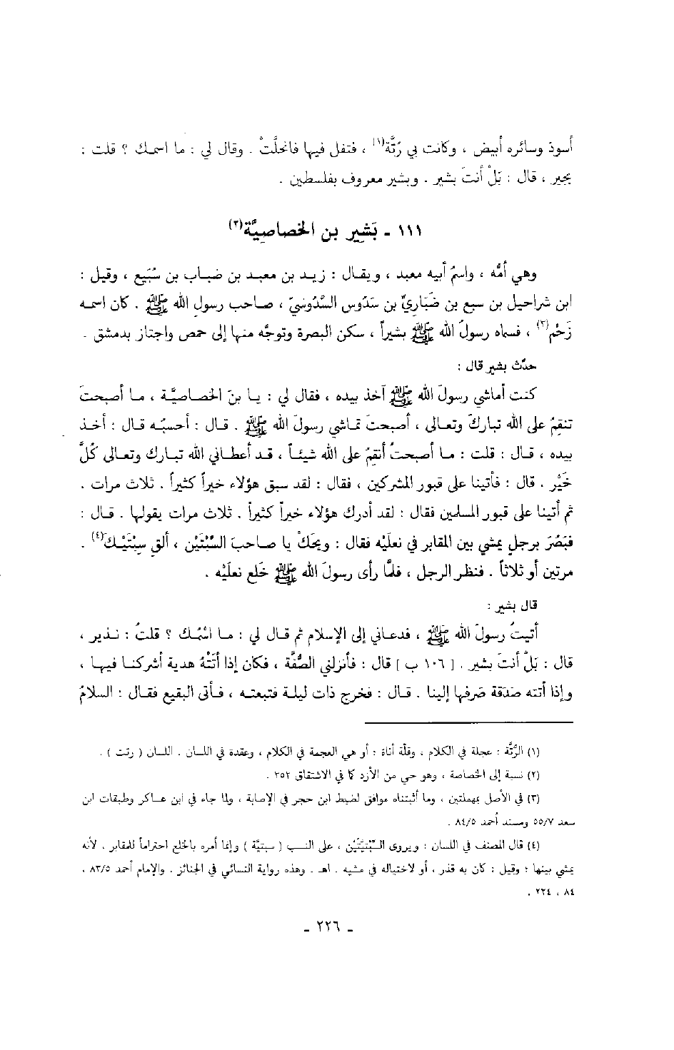 حدث بشير قال: كنت أماشي رسول الله صَلَّى اللهُ عَلَيْهِ وَسَلَّمَ آخذ بيده، فقال لي: " يا بن الخصاصية، ما أصبحت تنقم على الله تبارك وتعالى، أصبحت تماشي رسول الله صَلَّى اللهُ عَلَيْهِ وَسَلَّمَ ".