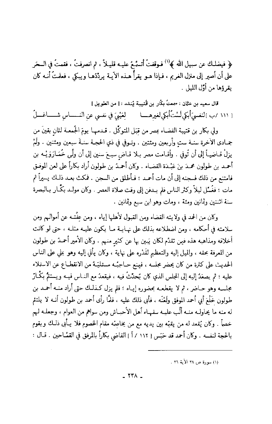 فيضلك عن سبيل الله " فوقفت أتسمع عليه قليلاً، ثم انصرفت، فقمت في السحر على أن أصير إلى منزل الغريم، فإذا هو يقرأ هذه الآية يرددها ويبكي، فعلمت أنه كان يقرؤها من أول الليل.