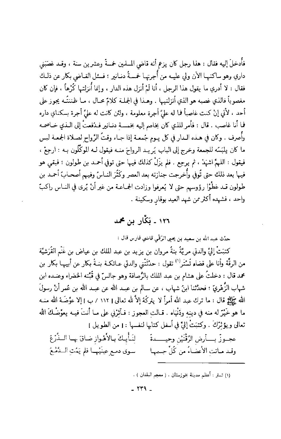 فأدخل إليه فقال: هذا رجل كان يزعم أنه قاضي المسلمين خمسةً وعشرين سنة، وقد غصبني داري وهو ساكنها الآن ولي عليه من أجرتها خمسة دنانير؛ فسئل القاضي بكار عن ذلك فقال: لا أدري ما يقول هذا الرجل، أنا لم أنزل هذه الدار، وإنما أنزلتها كرهاً، فإن كان مغصوباً فالذي غصبه هو الذي أنزلنيها.