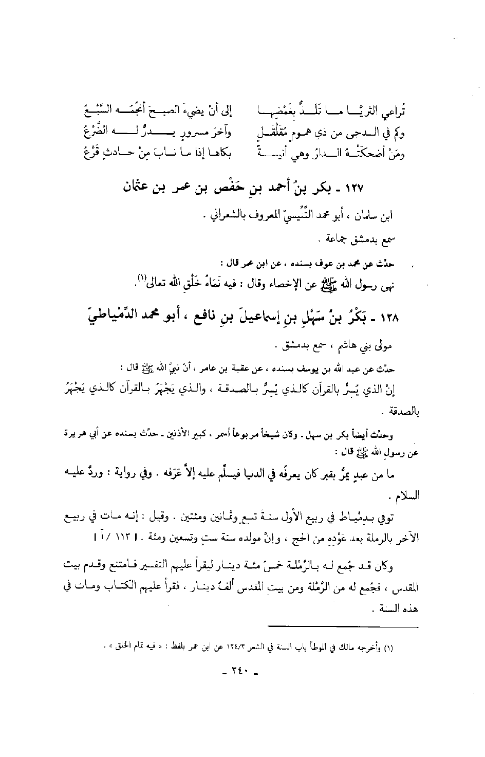 وحدث أيضاً بكر بن سهل - وكان شيخاً مربوعاً أسمر، كبير الأذنين حدث بسنده عن أبي هريرة عن رسول الله صَلَّى اللهُ عَلَيْهِ وَسَلَّمَ قال: " ما من عبدٍ يمر بقبر كان يعرفه في الدنيا فيسلم عليه إلا عرفه ".