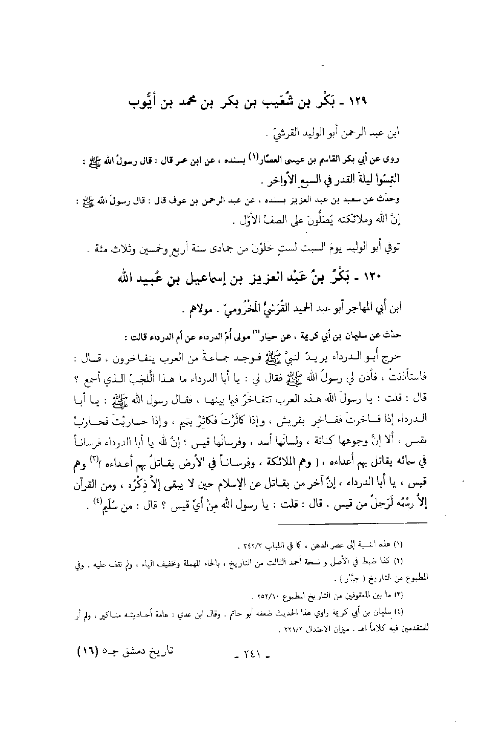 حدث عن سليمان بن أبي كريمة، عن حيار مولى أم الدرداء عن أم الدرداء قالت: خرج أبو الدرداء يريد النبي صَلَّى اللهُ عَلَيْهِ وَسَلَّمَ فوجد جماعةً من العرب يتفاخرون، قال: فاستأذنت، فأذن لي رسول الله صَلَّى اللهُ عَلَيْهِ وَسَلَّمَ فقال لي: " يا أبد الدرداء ما هذا اللجب الذي أسمع؟ " قال: قلت: يا رسول الله هذه العرب تتفاخر فيما بينها، فقال رسول الله صَلَّى اللهُ عَلَيْهِ وَسَلَّمَ: " يا أبا الدرداء إذا فاخرت ففاخر بقريش، وإذا كاثرت فكاثر بتميم، وإذا حاربت فحارب بقيس، إلا أن وجوهها كنانة، ولسانها أسد، وفرسانها قيس؛ إن لله يا أبا الدرداء فرساناً في سمائه يقاتل بهم أعدائه، وهم الملائكة، وفرساناً في الأرض يقاتل بهم أعداءه وهم قيس، يا أبا الدرداء، إن آخر من يقاتل عن الإسلام حين لا يبقى إلا ذكره، ومن القرآن إلا رسمه لرجلٌ من قيس ".