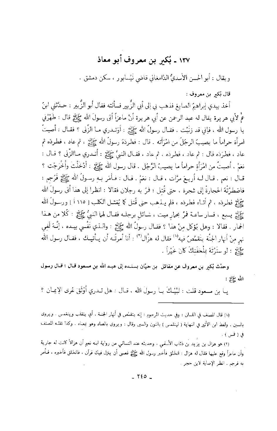 قال بكير بن معروف: أخذ بيدي إبراهيم الصايغ فذهب به إلى أبي الزبير فسألته فقال أبو الزبير: حدثني ابن عم لأبي هريرة يقال له عبد الرحمن عن أبي هريرة أن ماعزاً أتى رسول الله صَلَّى اللهُ عَلَيْهِ وَسَلَّمَ قال: طهرني يا رسول الله، فإني قد زنيت.