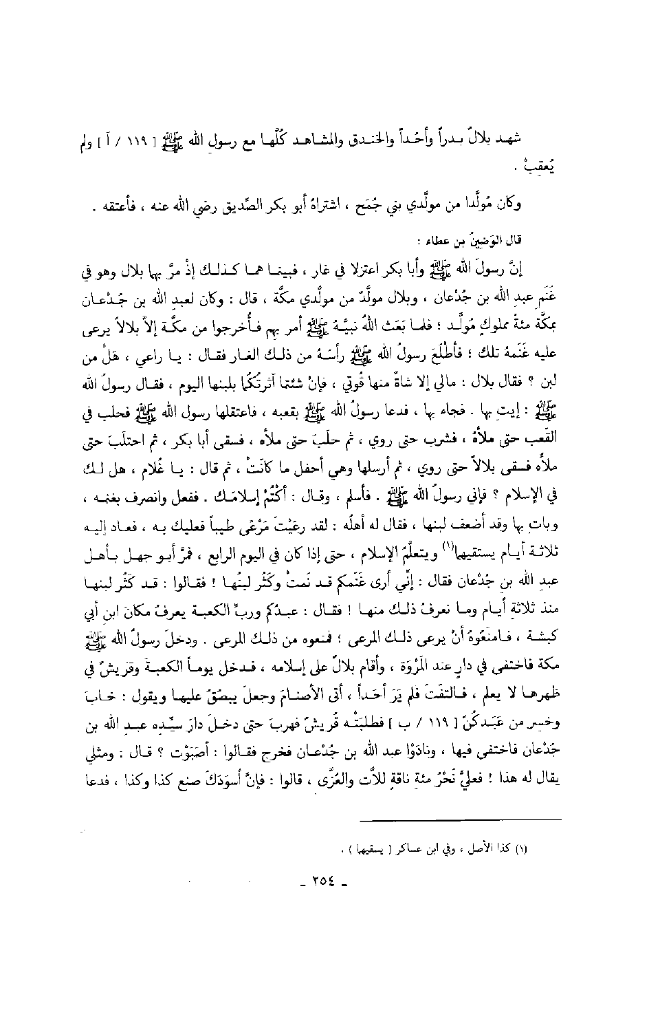 قال الوضين بن عطاء: إن رسول الله صَلَّى اللهُ عَلَيْهِ وَسَلَّمَ وأبا بكر اعتزلا في الغار، فبينما هما كذلك إذ مر بهما بلال وهو في غنم عبد الله بن جدعان، وبلال مولد من مولدي مكة، قال: وكان لعبد الله بمكة مائة مملوكٍ مولد؛ فلما بعث الله نبيه صَلَّى اللهُ عَلَيْهِ وَسَلَّمَ أمر بهم فأخرجوا من مكة إلا بلالاً يرعى عليه غنمه تلك؛ فأطلع رسول الله صَلَّى اللهُ عَلَيْهِ وَسَلَّمَ رأسه من ذلك الغار فقال: " يا راعي، هل من لبن؟ " فقال بلال: ما لي إلا شاةٌ منها قوتي، فإن شئتما آثرتكما بلبنها اليوم، فقال رسول الله صَلَّى اللهُ عَلَيْهِ وَسَلَّمَ: إيت بها.